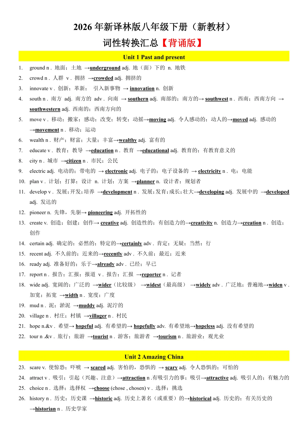 26年春新教材八年级下册初中英语译林版词性转换汇总(背诵版),可打印