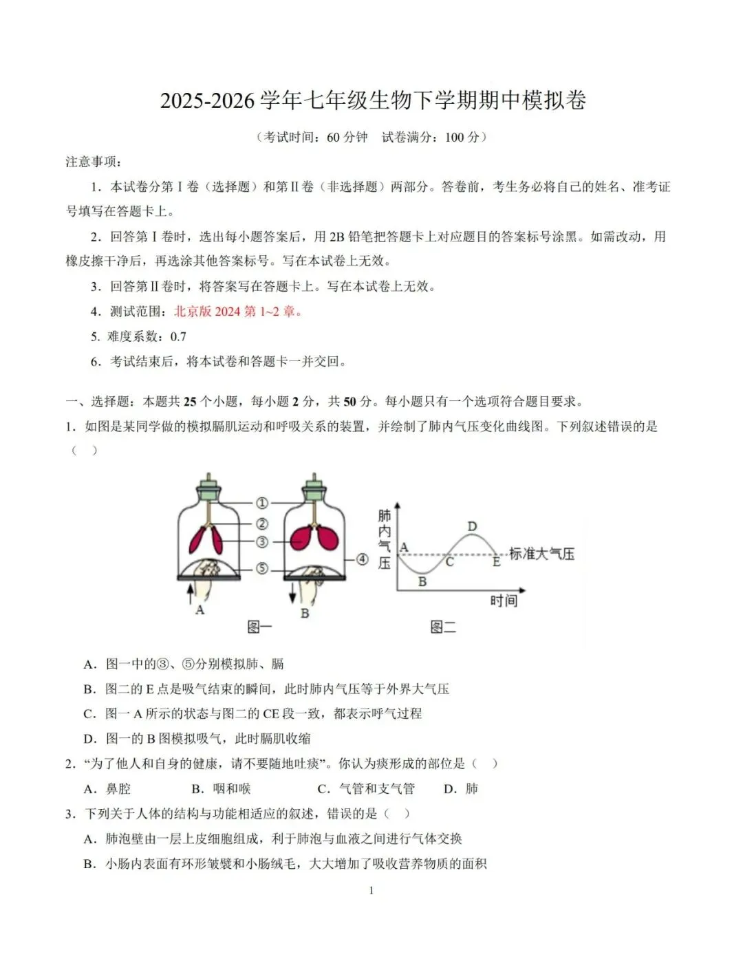 2025-2026学年 七年级下册北京版生物期中模拟卷【测试范围:第1~2章】(原卷版+解析版),建议收藏,打印练习! 点击上方蓝字关注我们 2025-2026学年 七年级下册北京版生物期中模拟卷【测试范围:第1~2章】(原卷版+解析版),电子版建议收藏,打印练习!