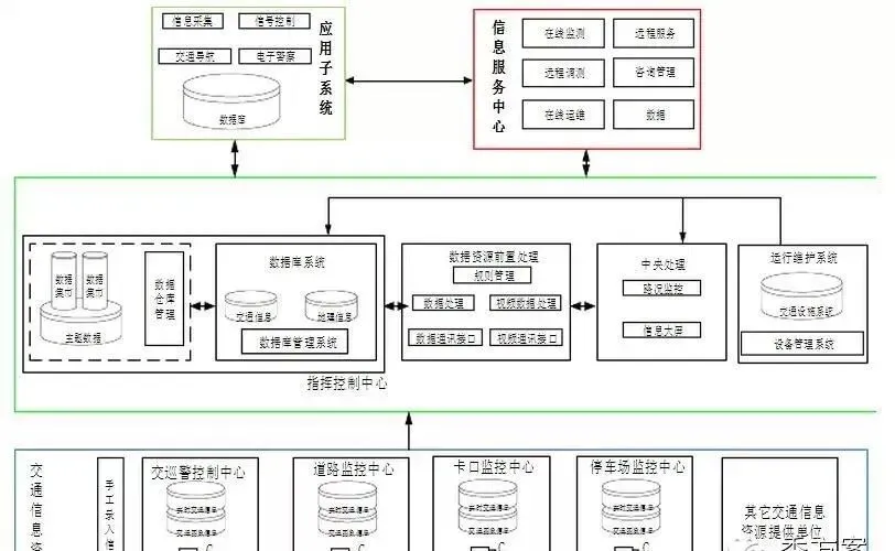 智能交通应用系统由应用子系统、信息服务中心和指挥控制中心三部分构成: