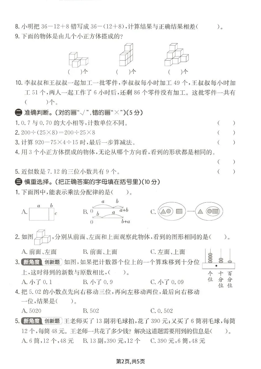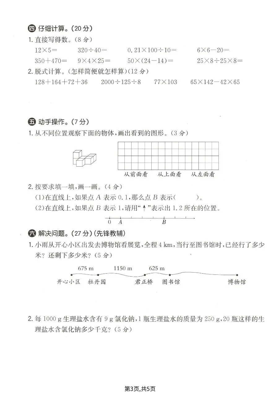 满分110分(含10分拓展题),限时90分钟,涵盖填空、判断、选择、计算、操作、解决问题六大题型,重点考查四则运算、运算定律、小数意义与单位换算、观察物体、实际应用等期中核心考点,附完整答案与解析,用于期中复习检测。