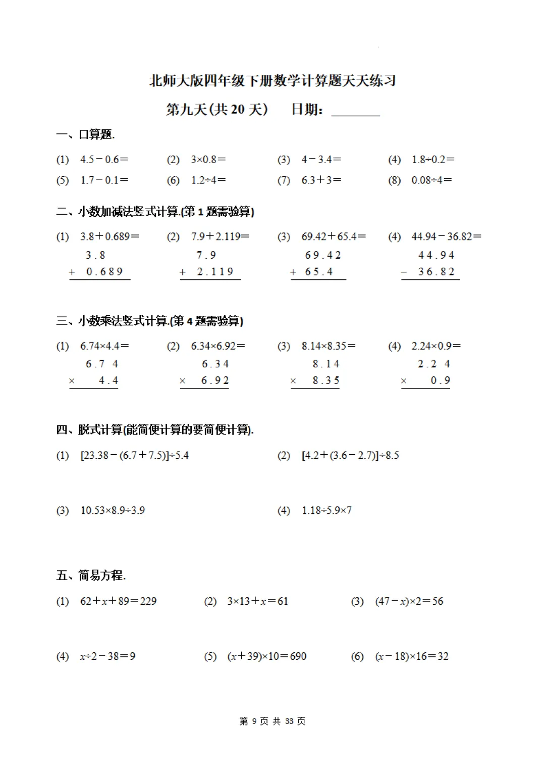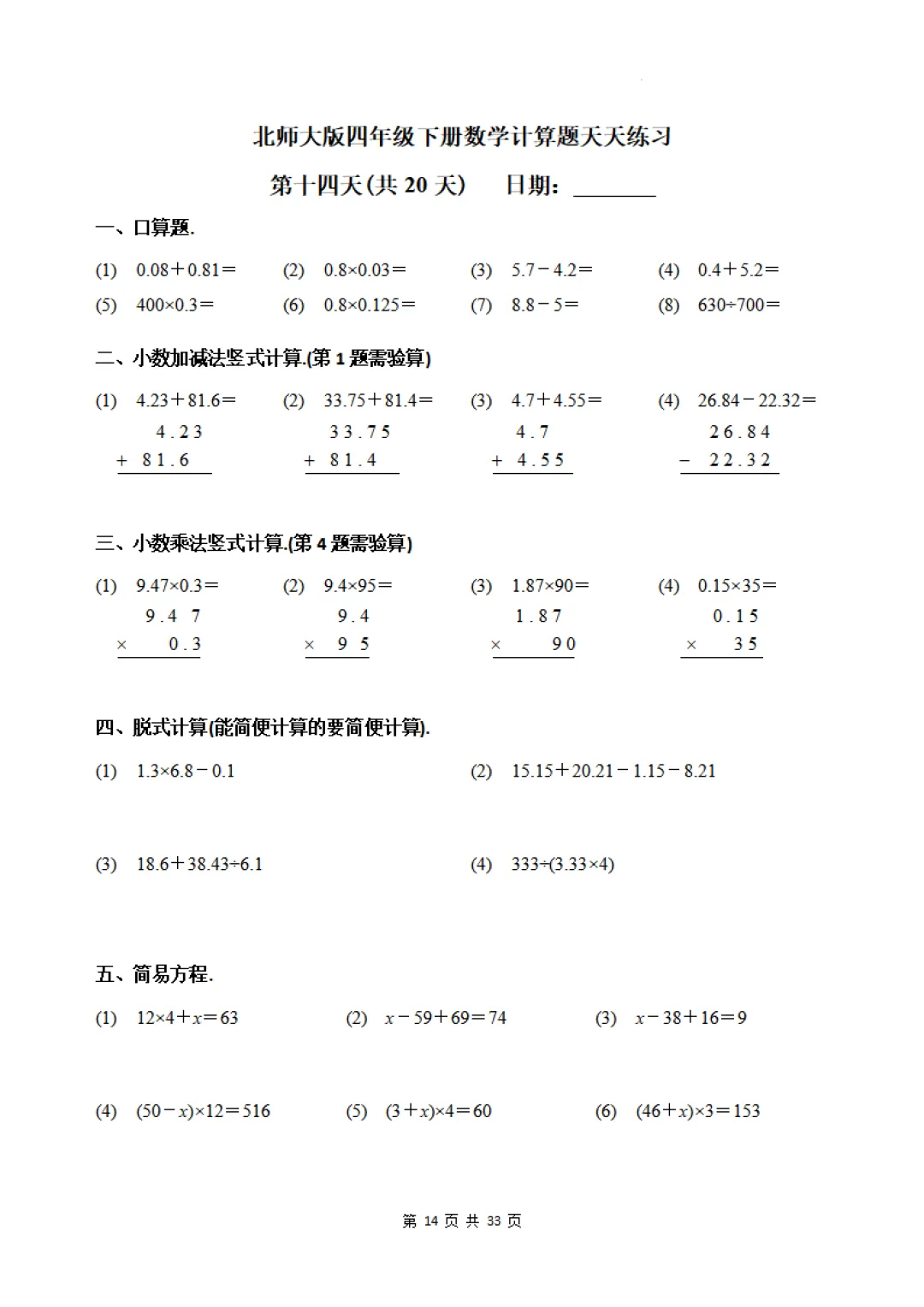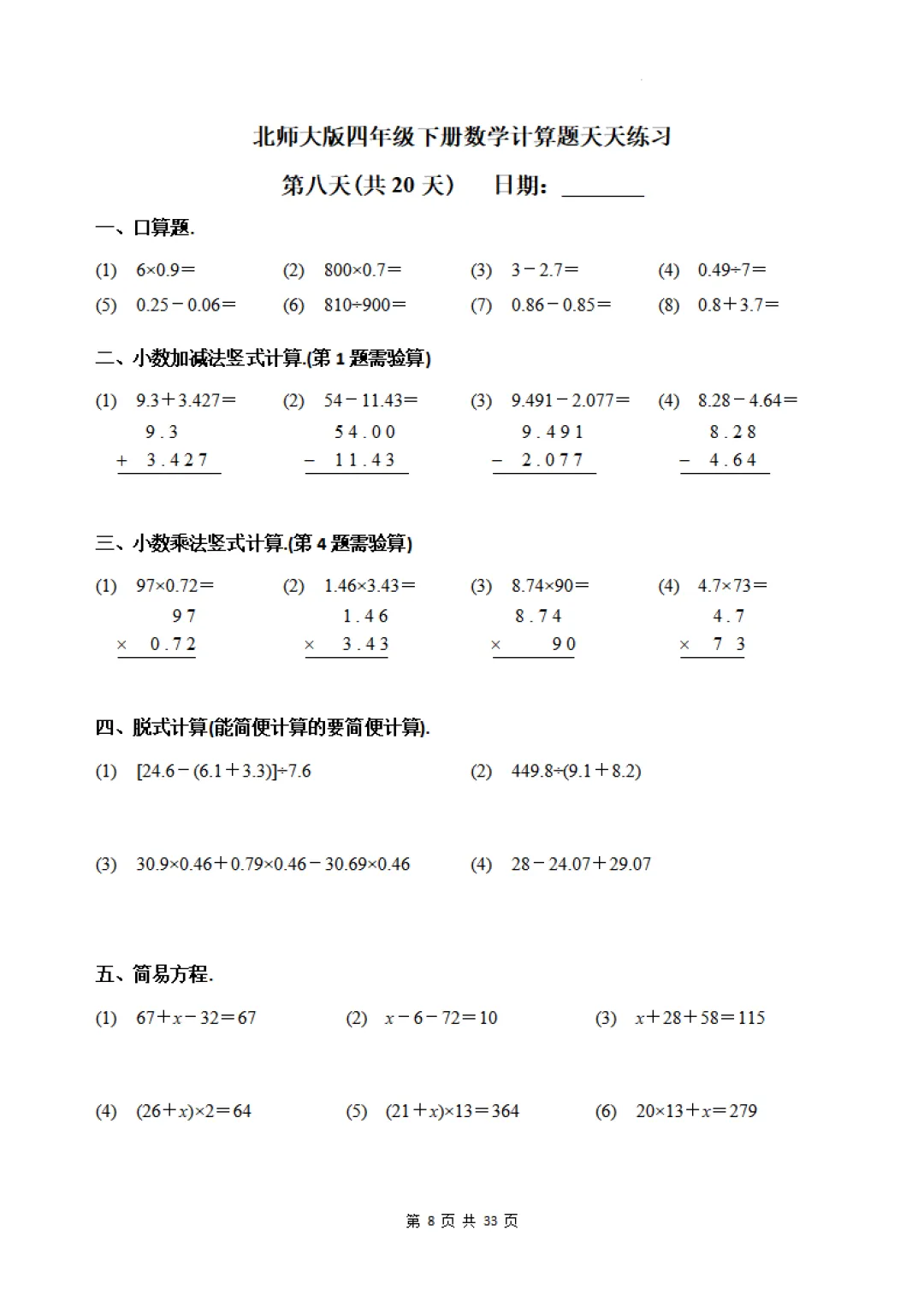 26春四年级下册数学(北师版)计算题天天练习|完整高清电子版可打印!