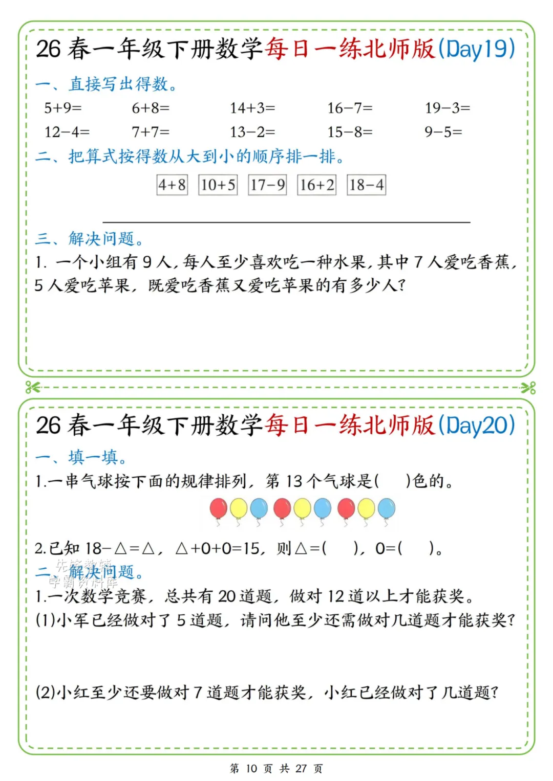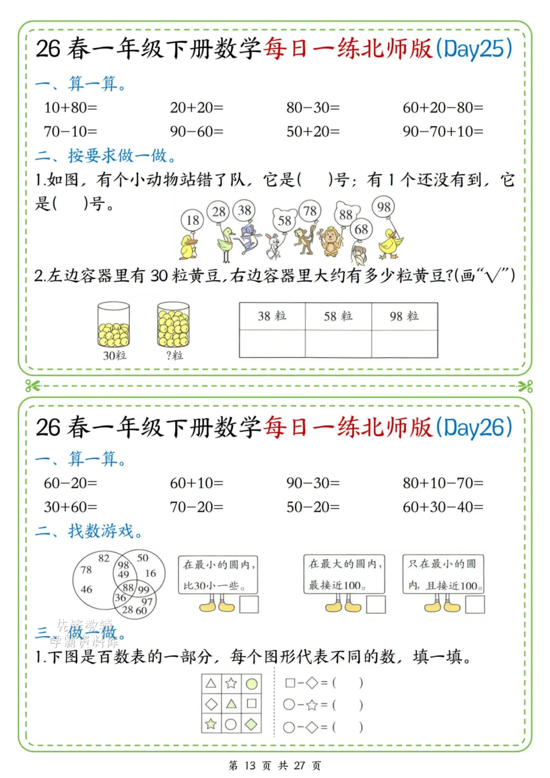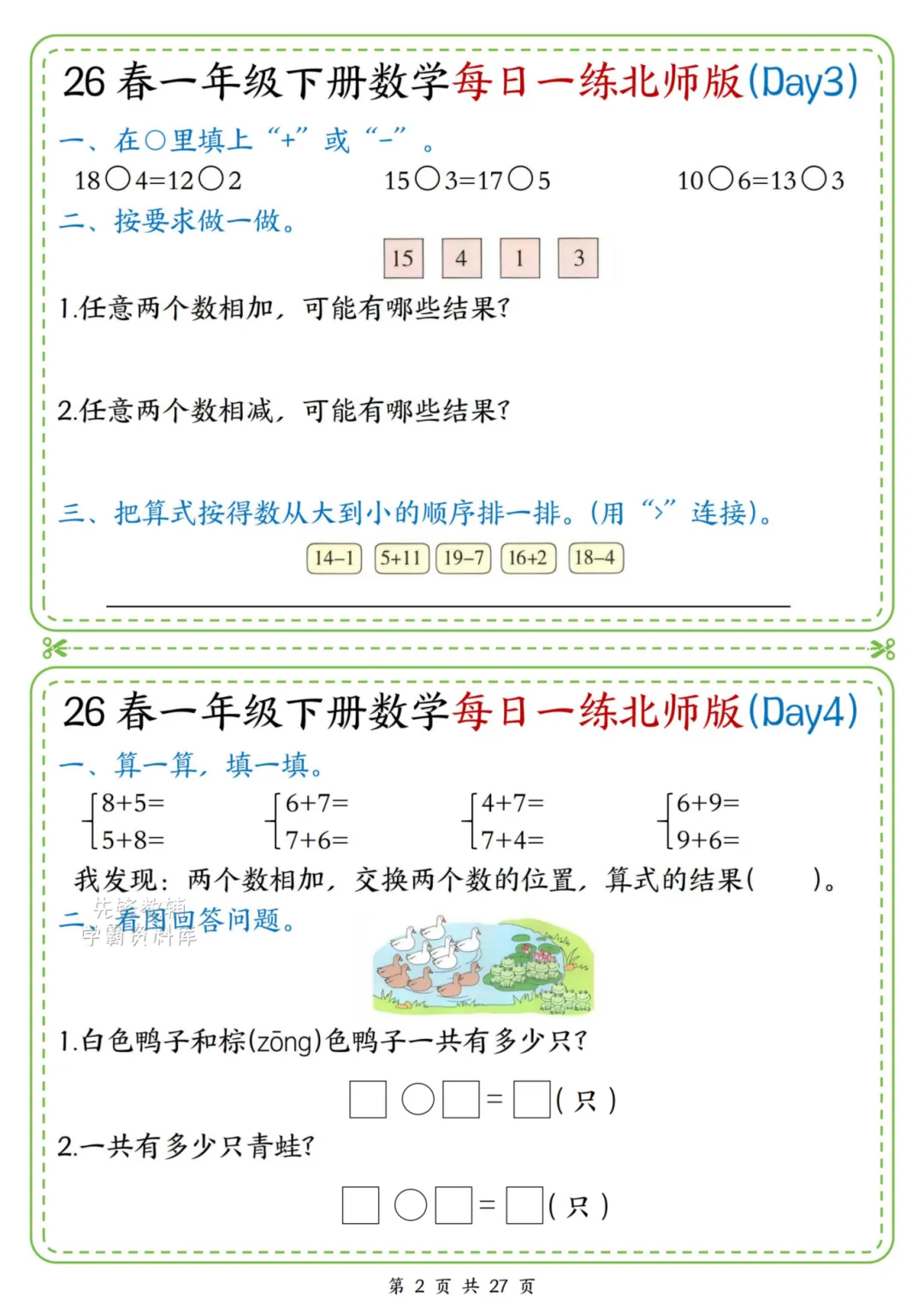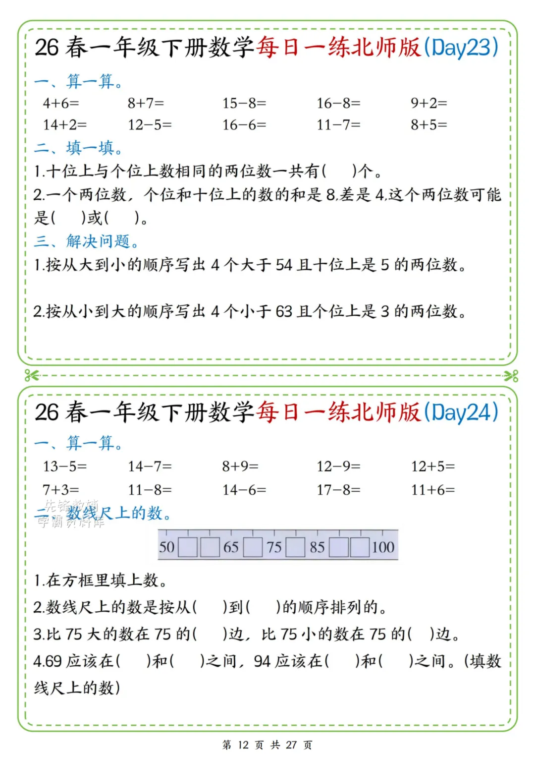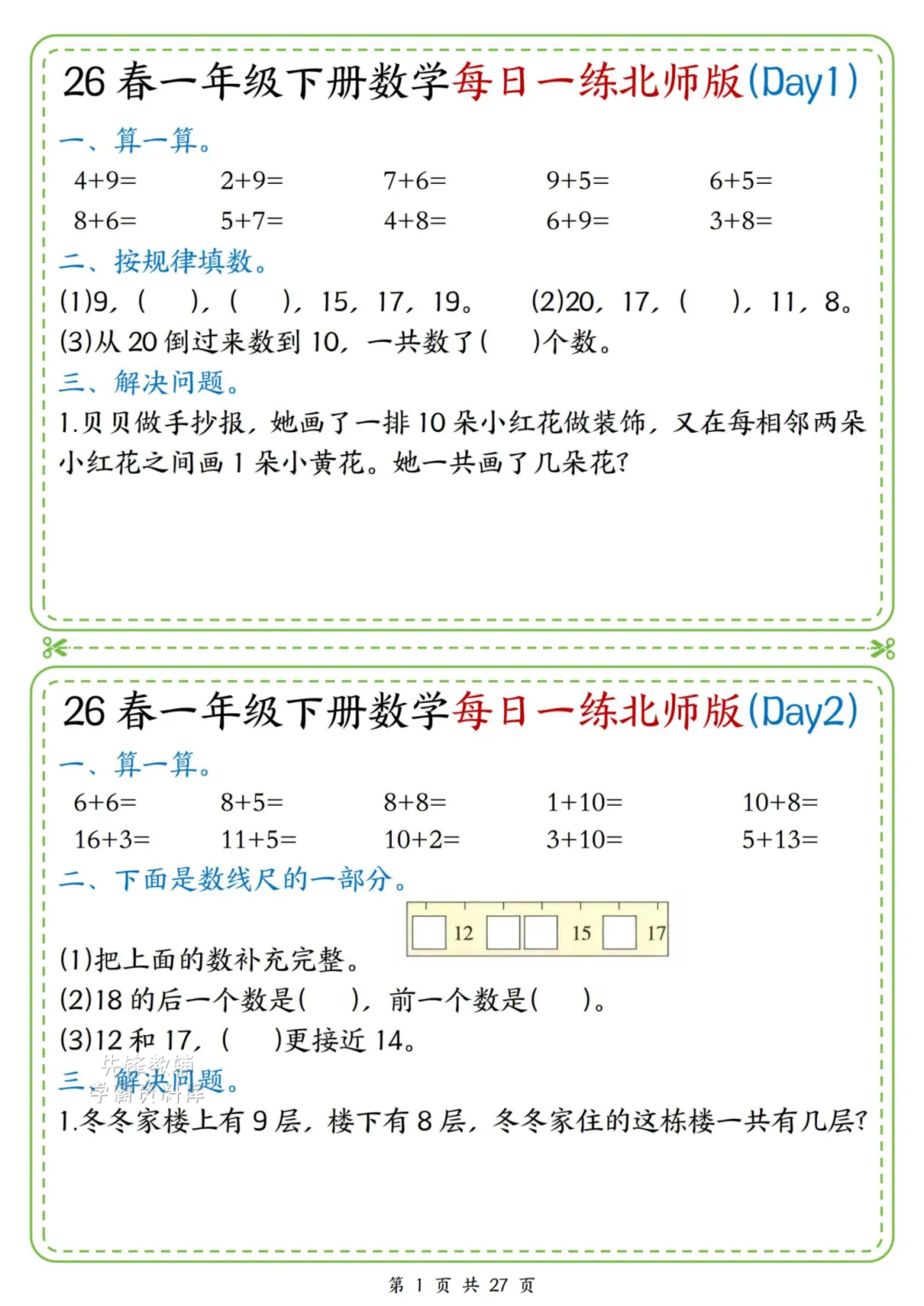2026春一年级下册北师大版数学《每日一练》(含答案),电子版可下载打印。这份资料题型基础又丰富,涵盖口算、规律、图形、解决问题等核心内容,题量适中、难度循序渐进,题目贴近孩子生活,形式活泼有趣,能有效夯实计算、数感与简单应用能力,适合日常同步训练使用。家长赶紧给孩子打印出来吧!