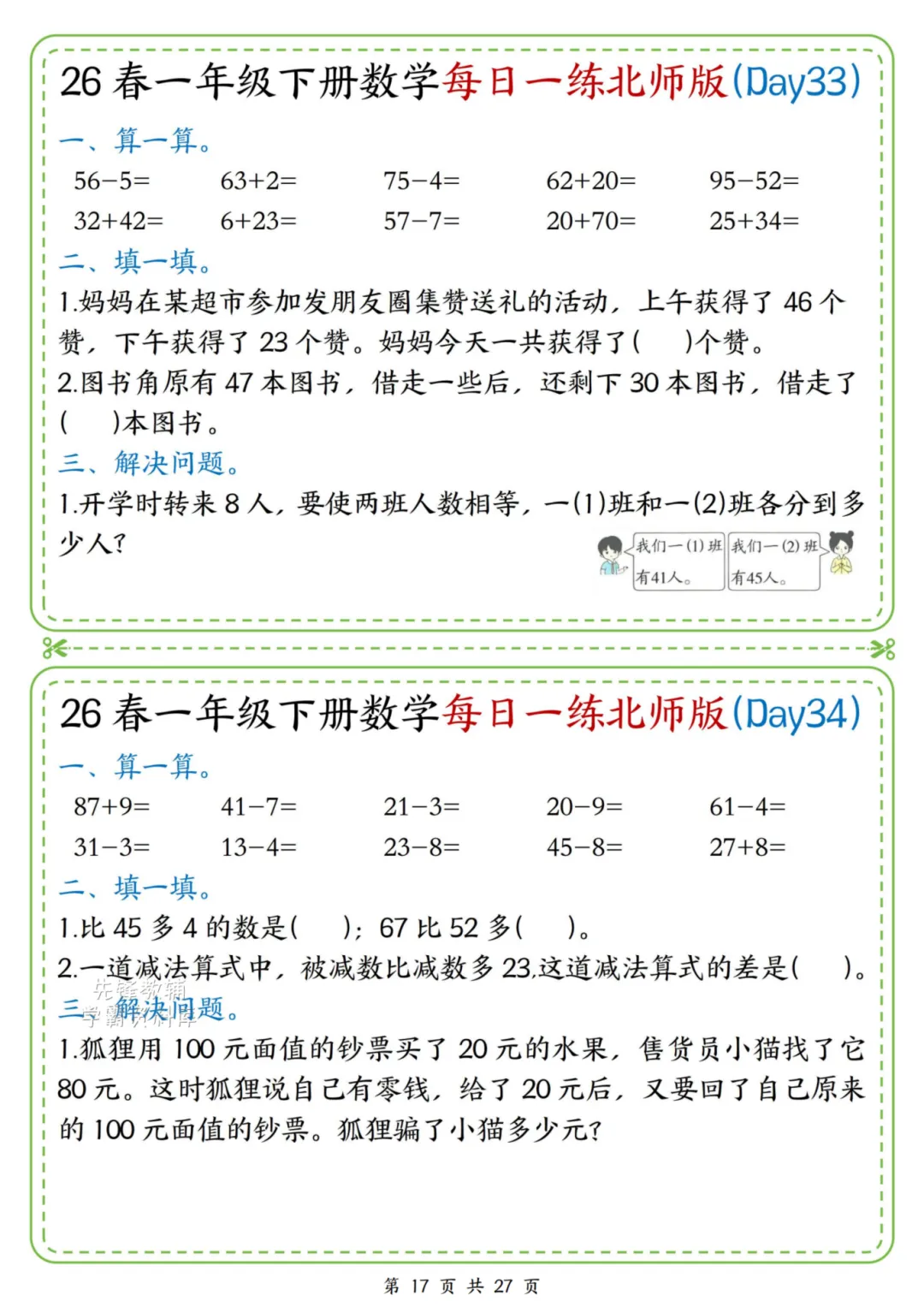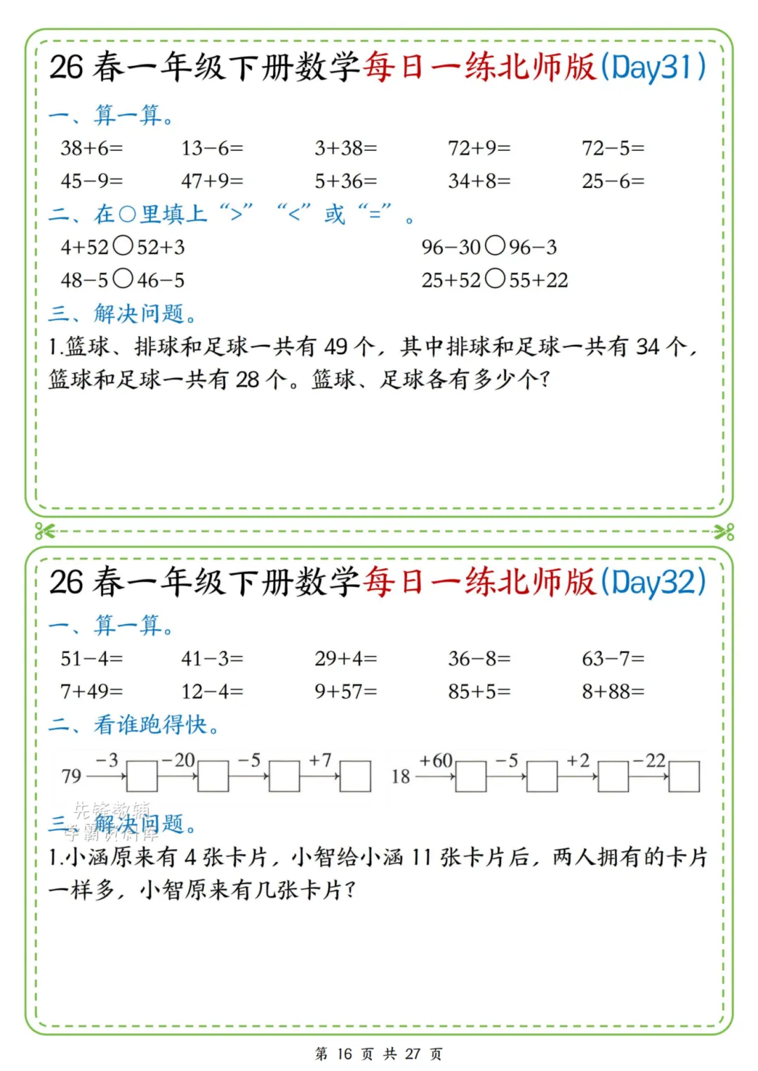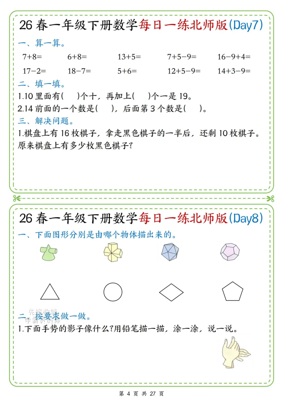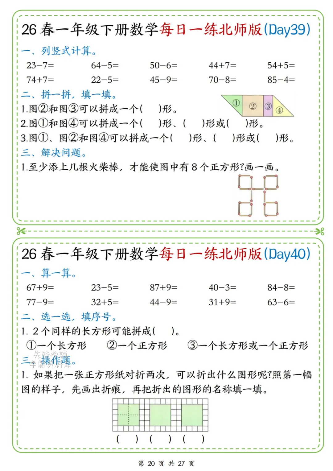 2026春一年级下册北师大版数学《每日一练》(含答案),电子版可下载打印。这份资料题型基础又丰富,涵盖口算、规律、图形、解决问题等核心内容,题量适中、难度循序渐进,题目贴近孩子生活,形式活泼有趣,能有效夯实计算、数感与简单应用能力,适合日常同步训练使用。家长赶紧给孩子打印出来吧!