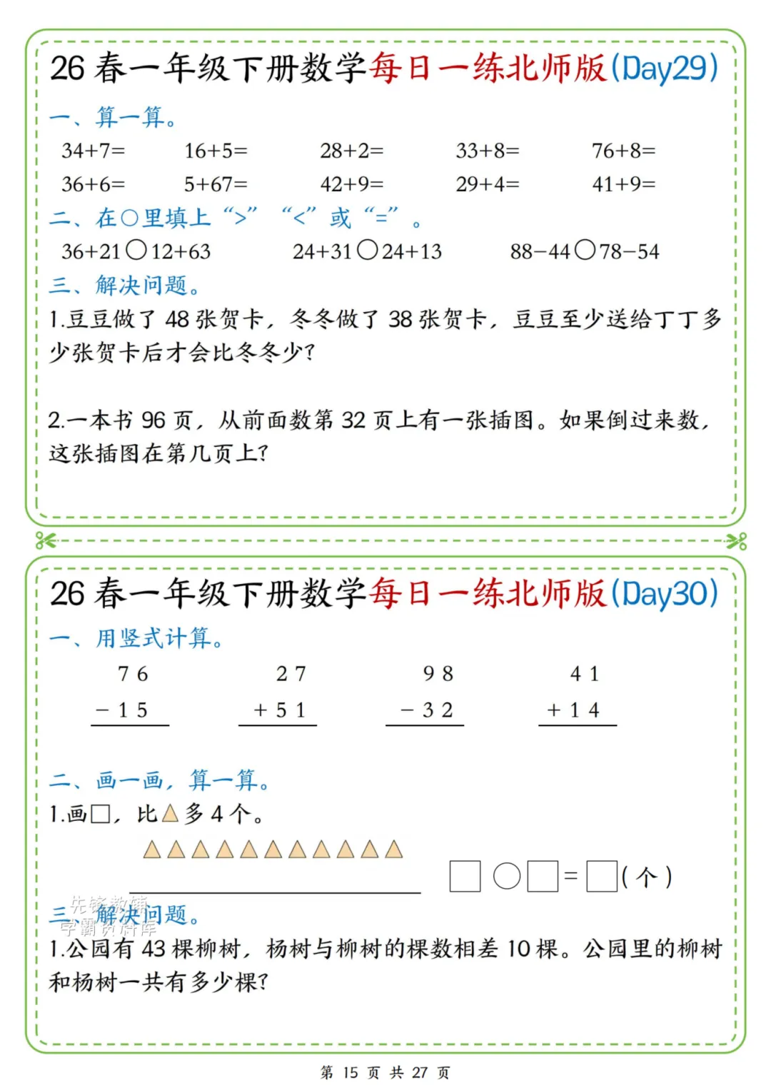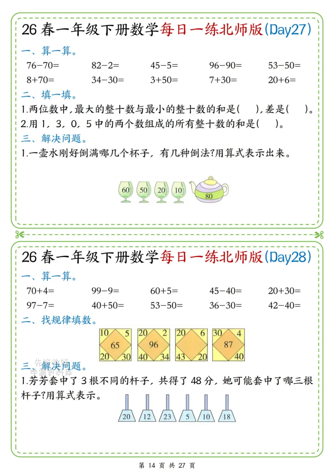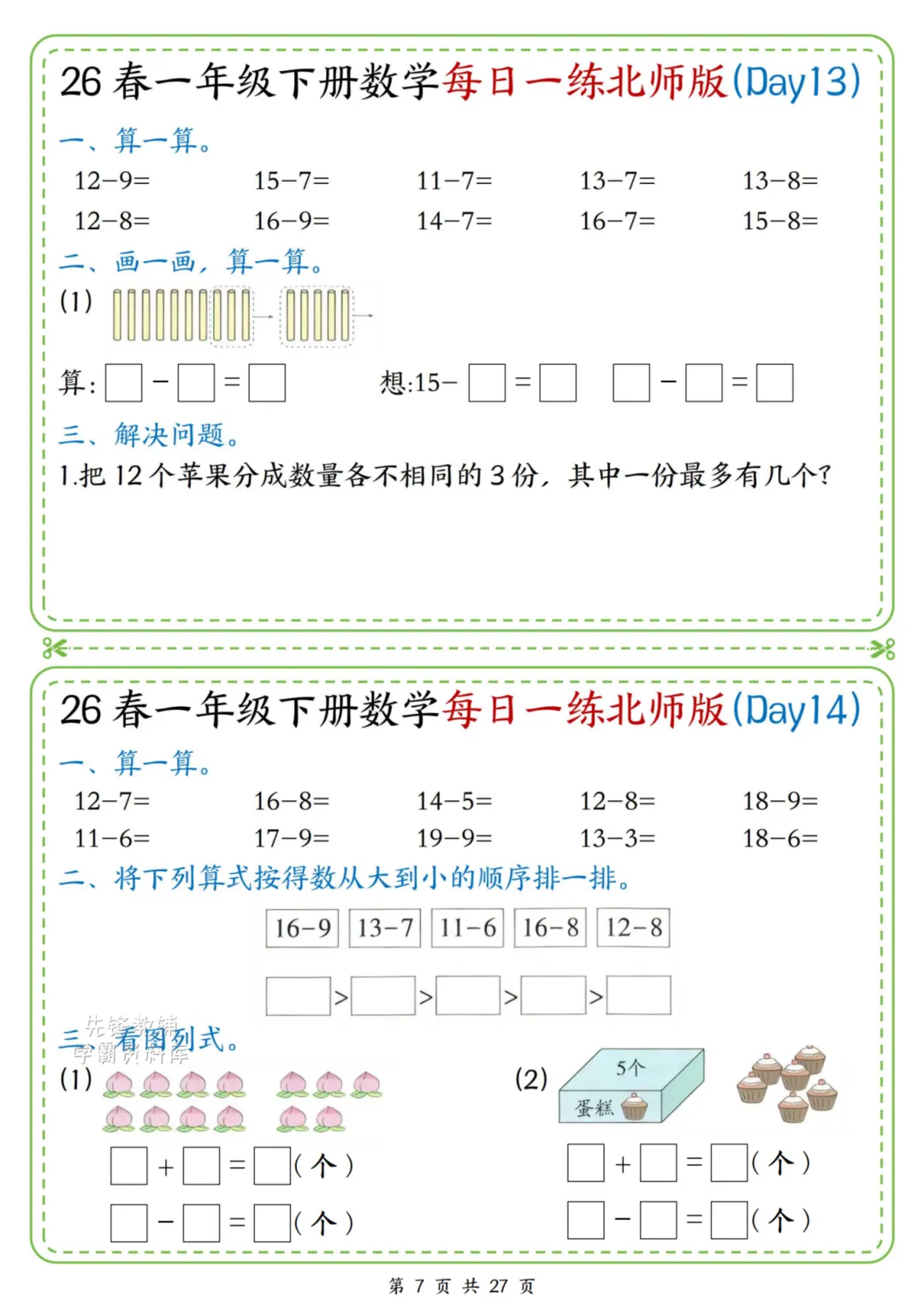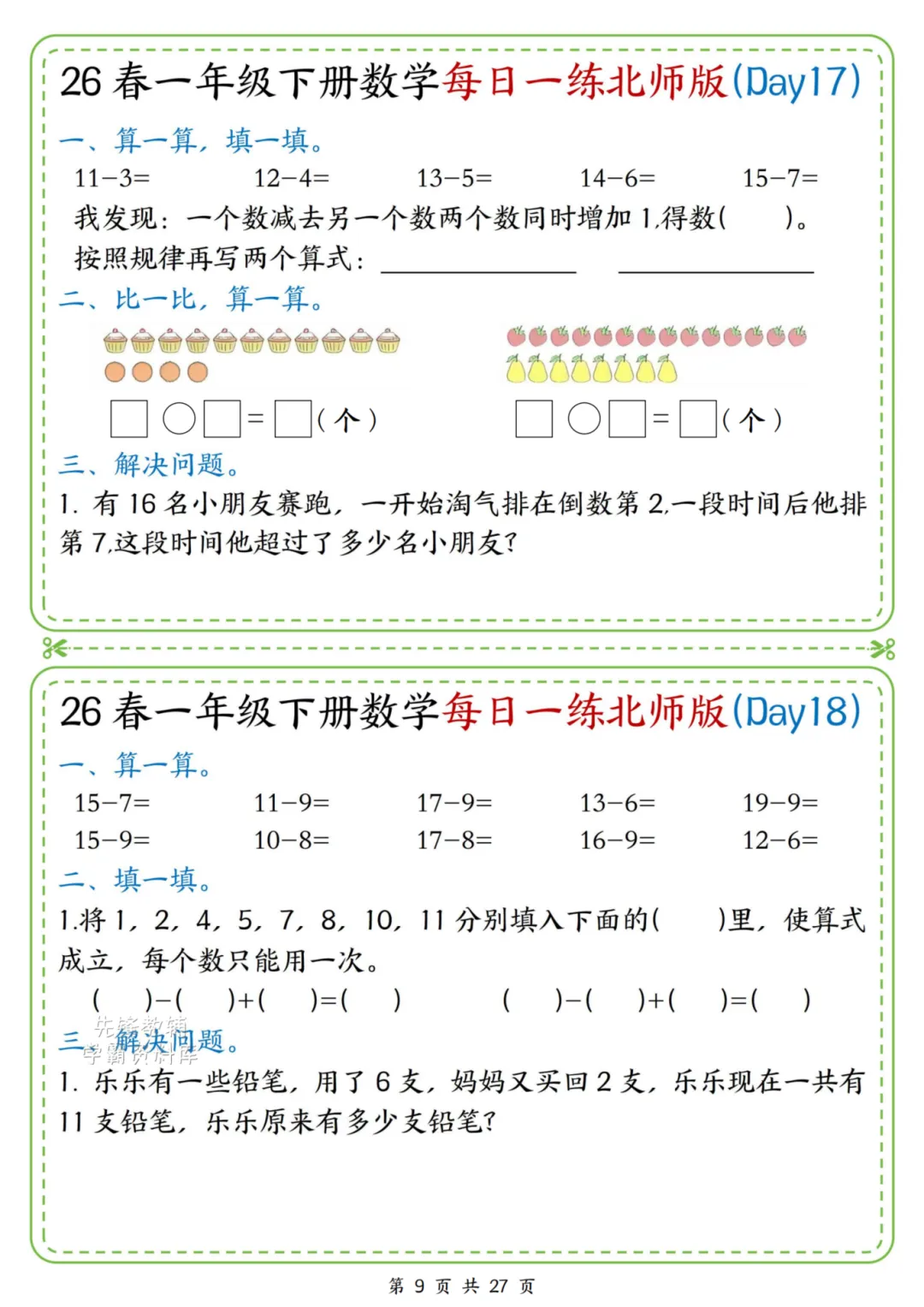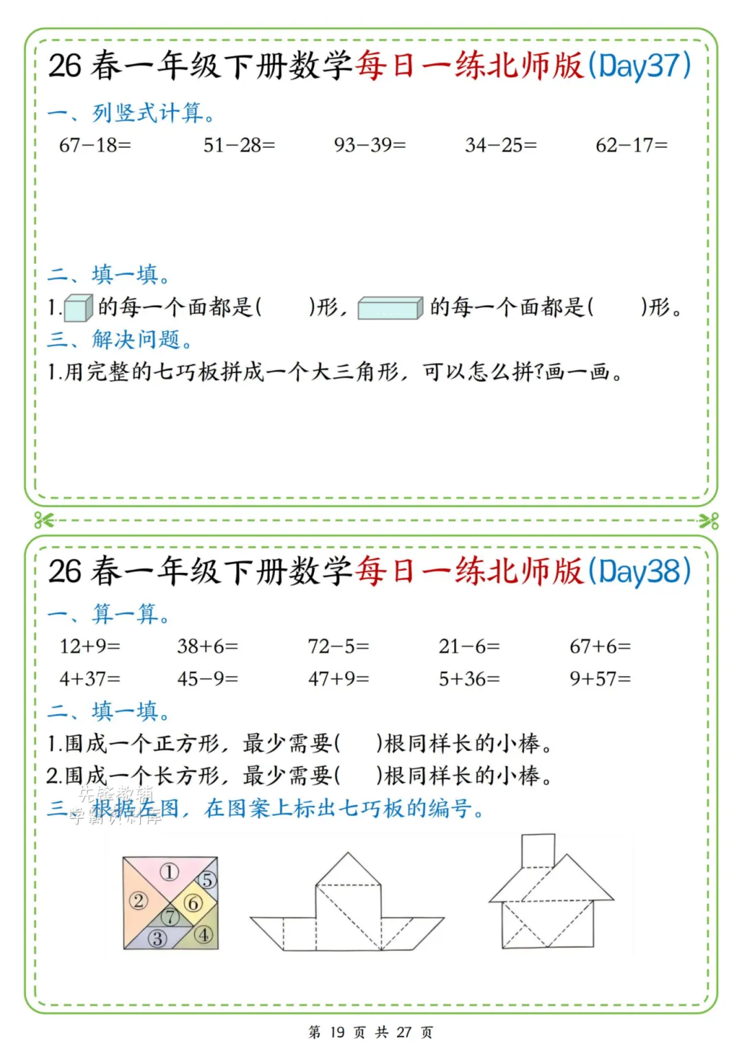 2026春一年级下册北师大版数学《每日一练》(含答案),电子版可下载打印。这份资料题型基础又丰富,涵盖口算、规律、图形、解决问题等核心内容,题量适中、难度循序渐进,题目贴近孩子生活,形式活泼有趣,能有效夯实计算、数感与简单应用能力,适合日常同步训练使用。家长赶紧给孩子打印出来吧!