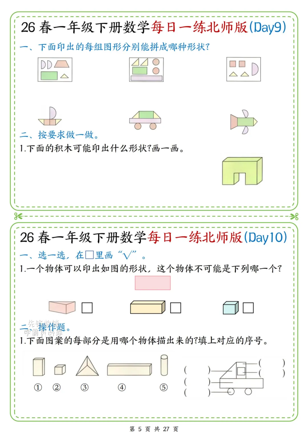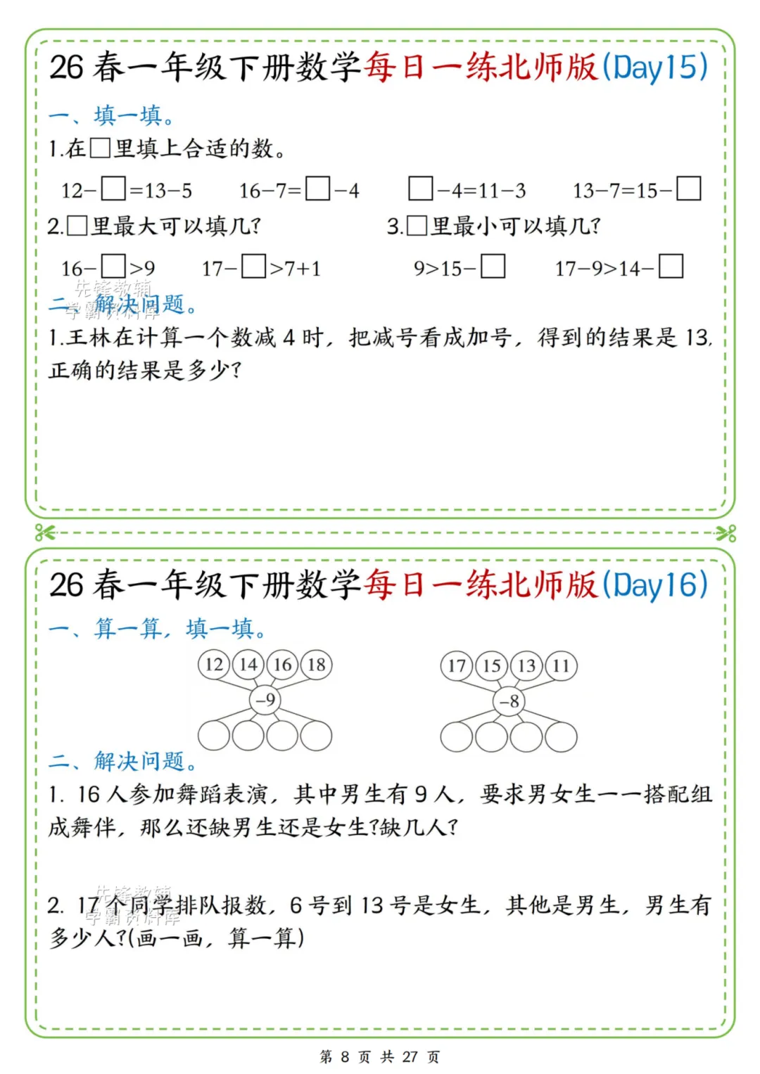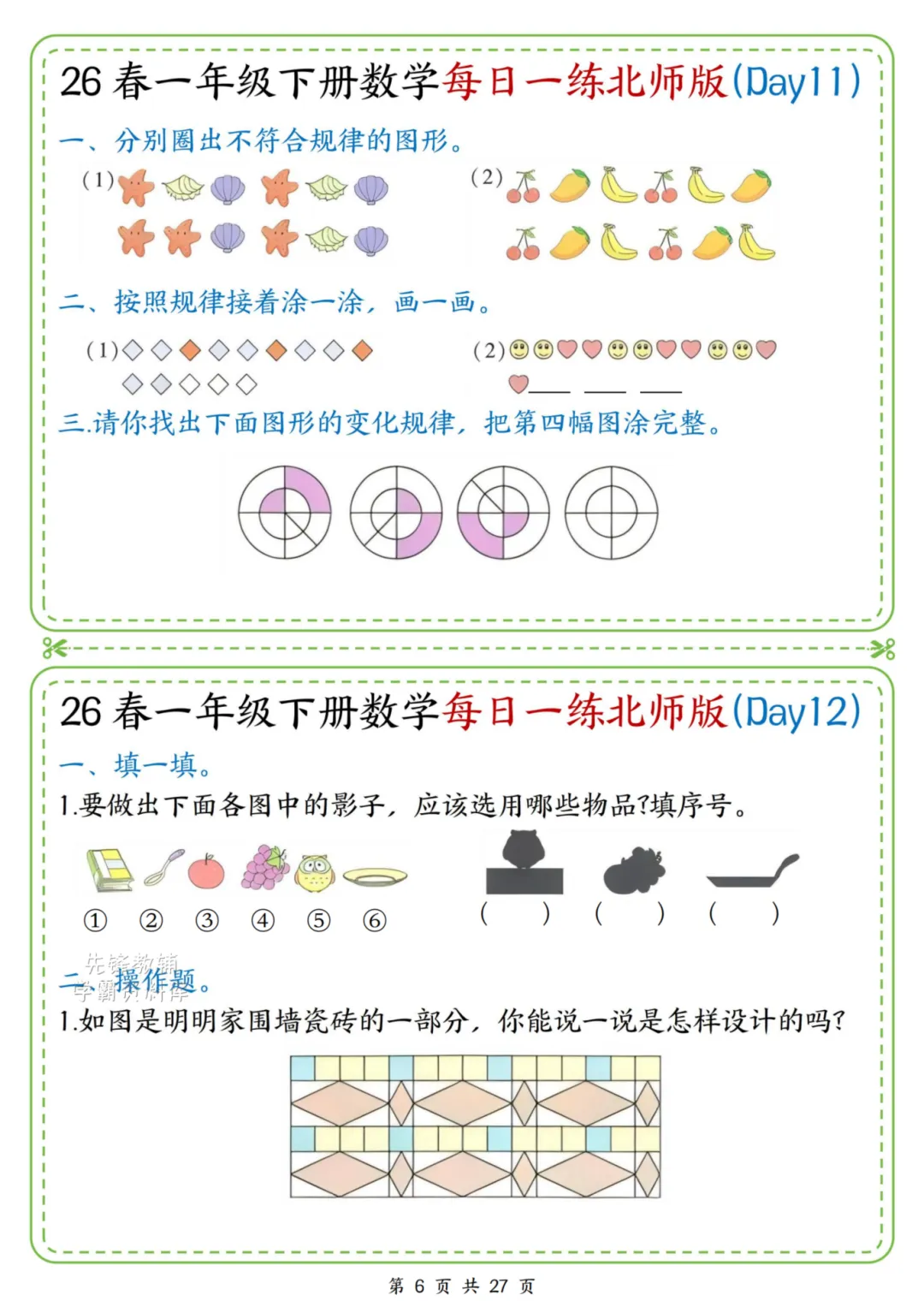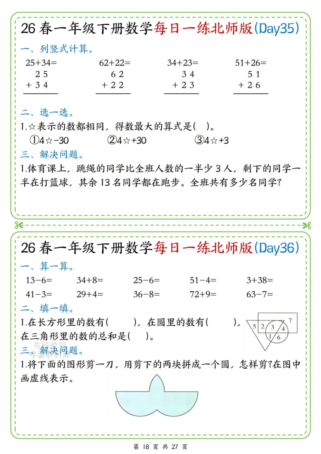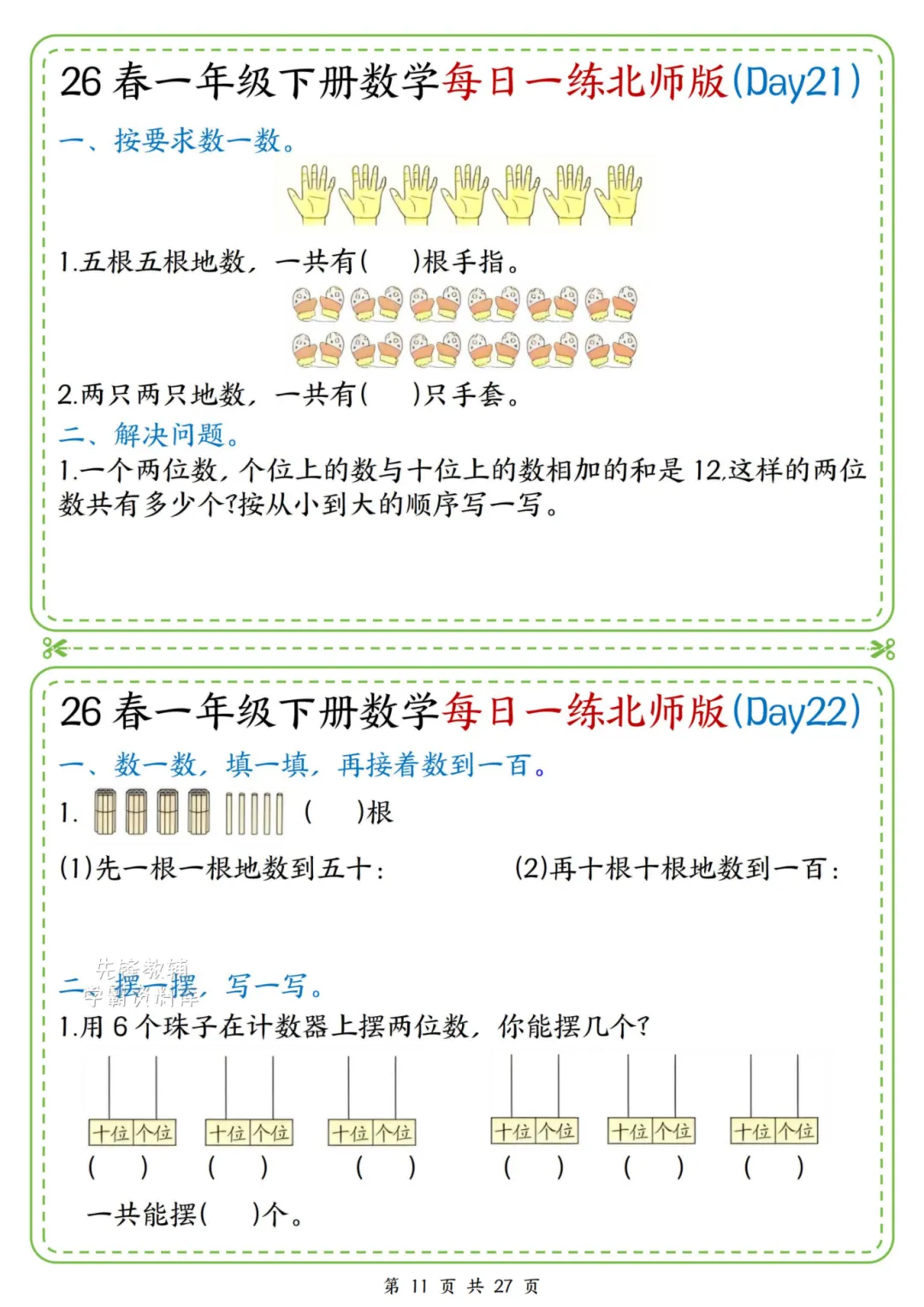 2026春一年级下册北师大版数学《每日一练》(含答案),电子版可下载打印。这份资料题型基础又丰富,涵盖口算、规律、图形、解决问题等核心内容,题量适中、难度循序渐进,题目贴近孩子生活,形式活泼有趣,能有效夯实计算、数感与简单应用能力,适合日常同步训练使用。家长赶紧给孩子打印出来吧!