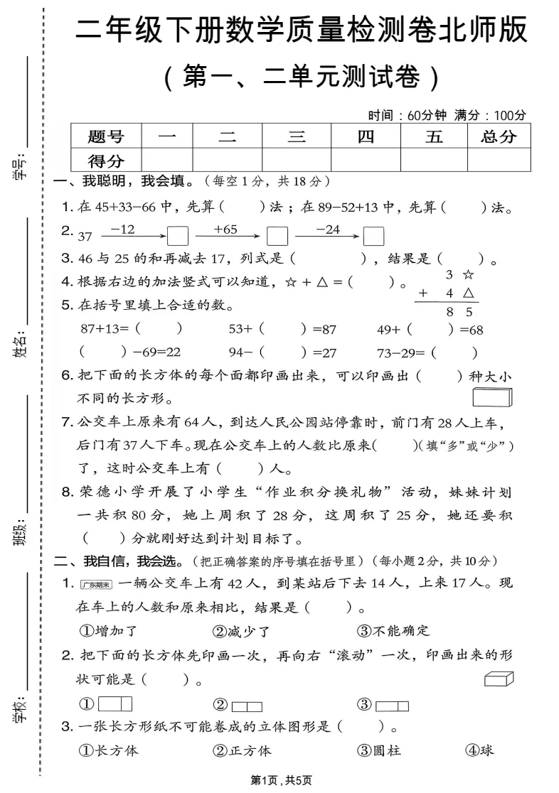 2026年北师大版二年级(下册)数学《第一单元测试卷》(共3套)有答案,电子版下载打印,试卷难度适中,紧扣教材 。