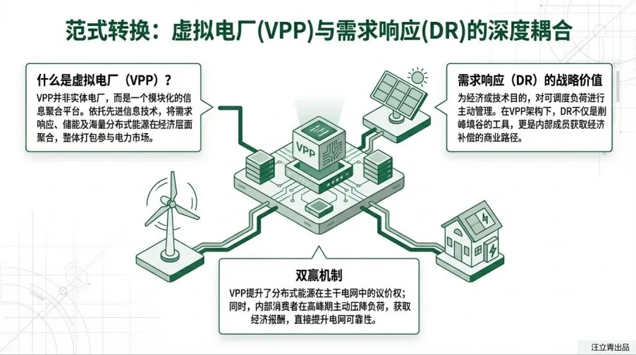 核心是解决新能源(风电、光伏)并网的麻烦 —— 风光发电不稳定,和电网需求对不上,容易出问题。虚拟电厂不是真电厂,是个聚合平台,把分布式能源、储能和可调节的用电负荷整合起来,再通过需求响应策略,引导用户在用电高峰主动少用电,还能给用户补贴。