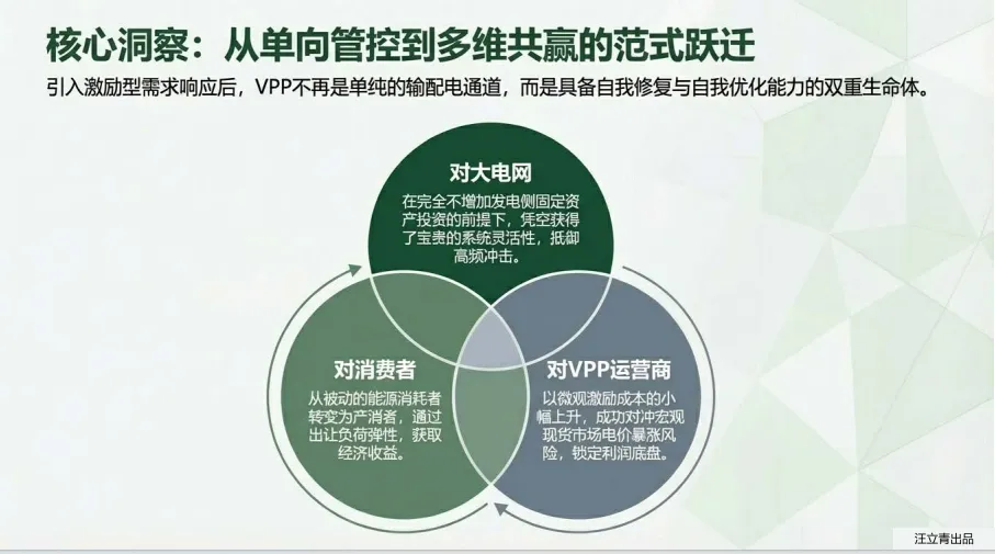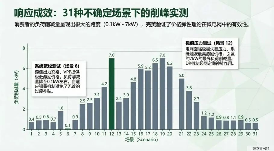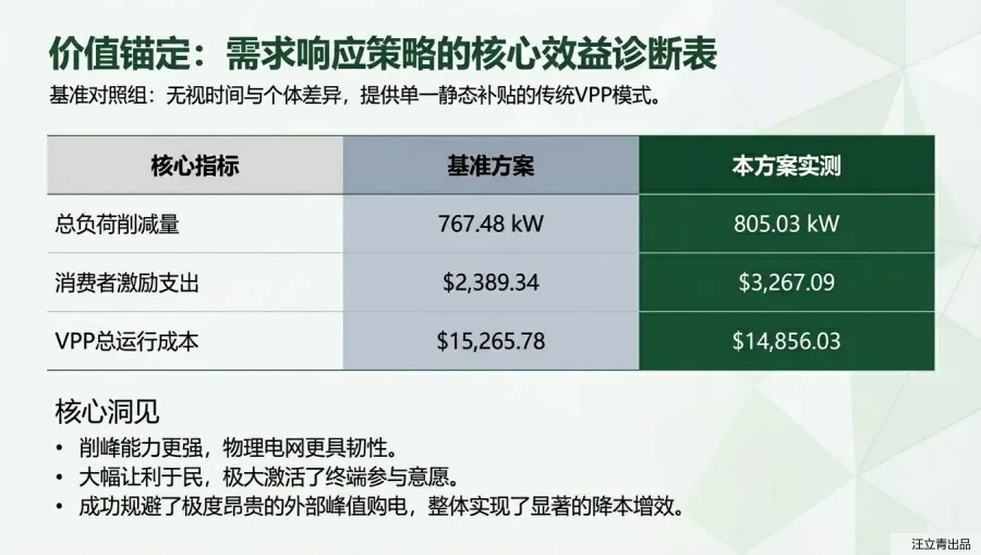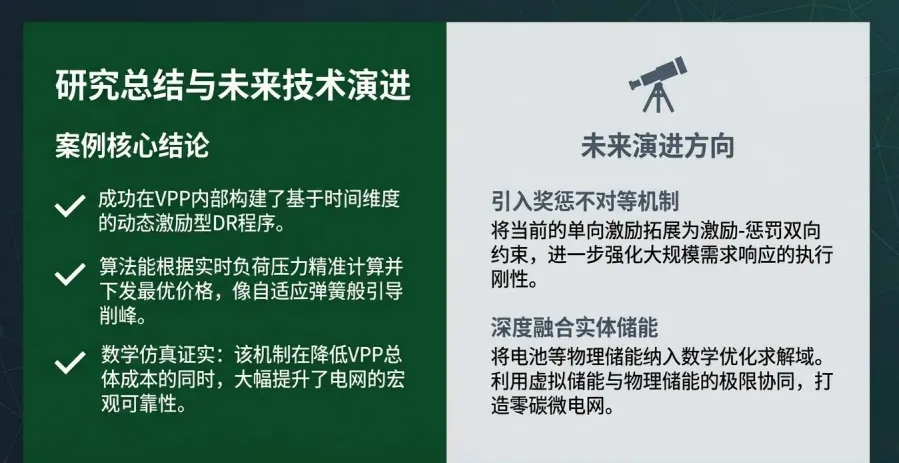 研究里用了专业模型和 31 种场景仿真,设计了动态激励价格,高峰时给高价补贴,引导用户削峰,实测比传统模式削峰更多、总运营成本更低。最后总结,这种策略实现了电网、用户、虚拟电厂运营商三方共赢,还提到了未来可以加入奖惩机制和实体储能的发展方向。