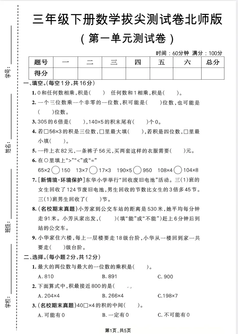 2026年北师大版三年级(下册)数学《第一单元测试卷》(共2套)有答案,电子版下载打印,试卷难度适中,紧扣教材 。