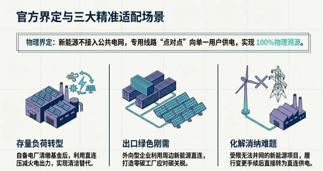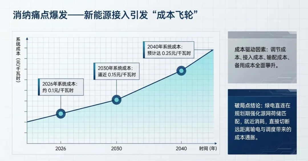 当前风光装机占比达 46%,新能源消纳进入深水区,调节、接入、输配、备用成本全面攀升,2026 年系统成本约 0.1 元 / 千瓦时,2030 年逼近 0.15 元 / 千瓦时,传统发 – 输 – 配 – 用模式失效。绿电直连以专用线路点对点供电,实现 100% 物理溯源,适配存量自备电厂转型、出口企业碳关税应对、新能源消纳难题化解三大场景。