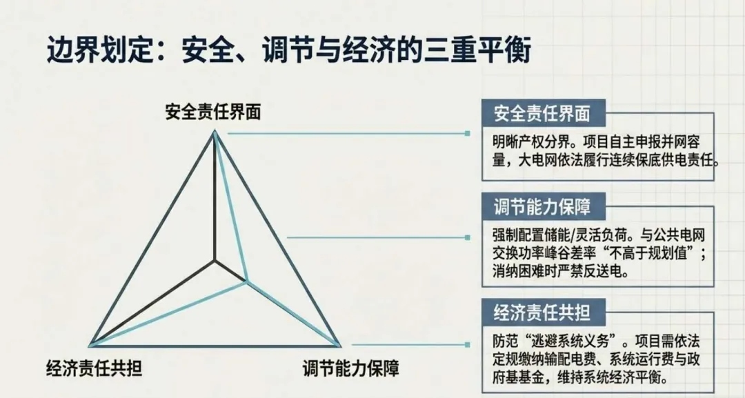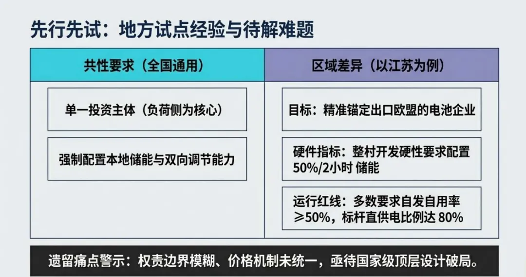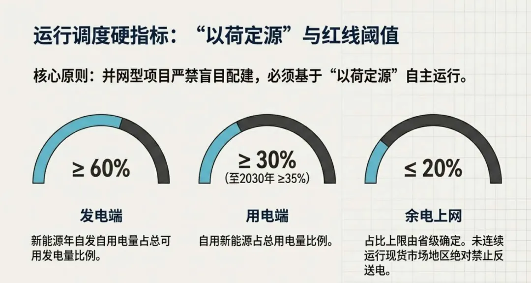 政策明确大系统保底、小系统直连独立分界,负荷侧为主责单位,多元主体可参与共建,源荷非同一主体需签署多年期 PPA 锁定权责。运行执行硬指标:新能源自发自用率≥60%,用户自用绿电占比≥30%(2030 年≥35%),余电上网≤20%,未运行现货地区禁止反送电。