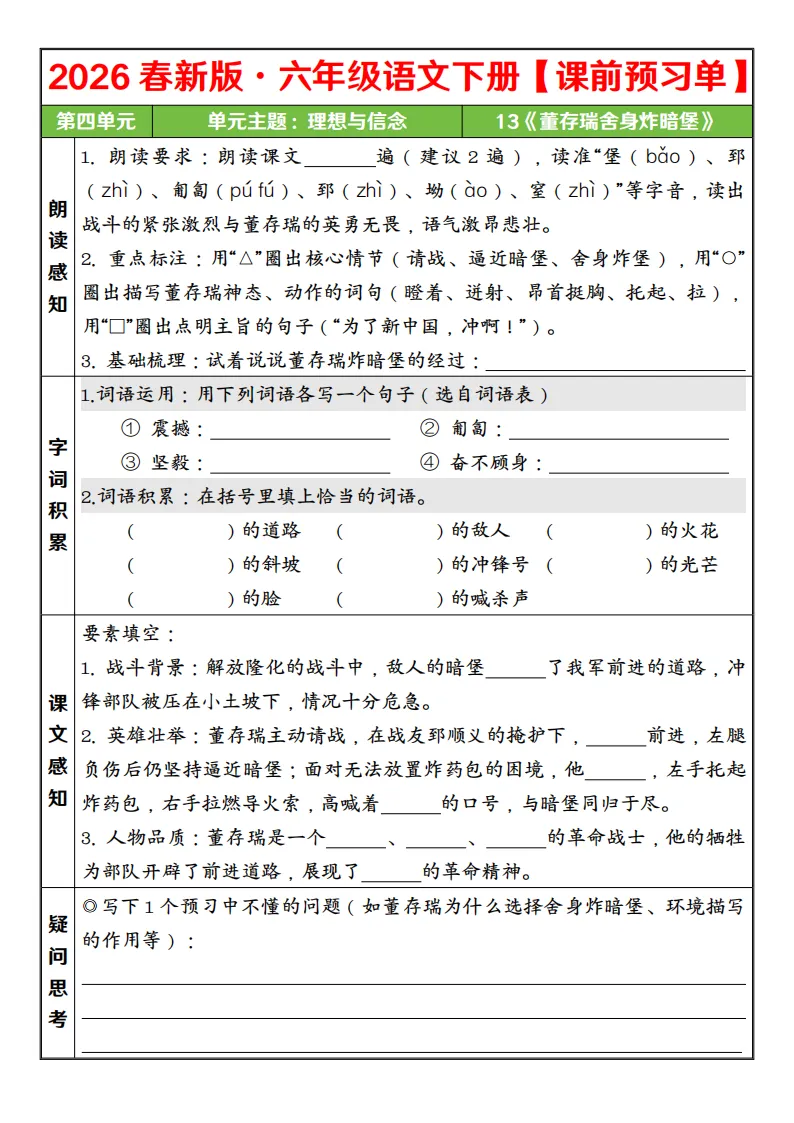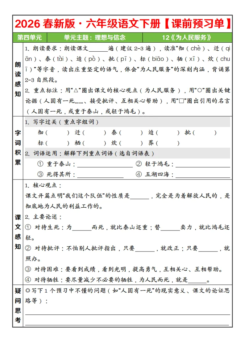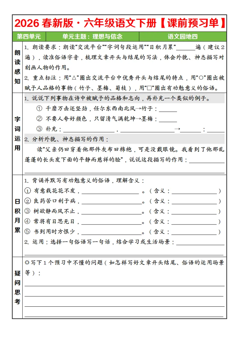 六年级预习没方向、课文抓不住重点、考点漏看?这份第四单元预习单超详细!生字、课文、主旨、问题全梳理,课前打卡一遍,上课听得懂、考试不丢分。