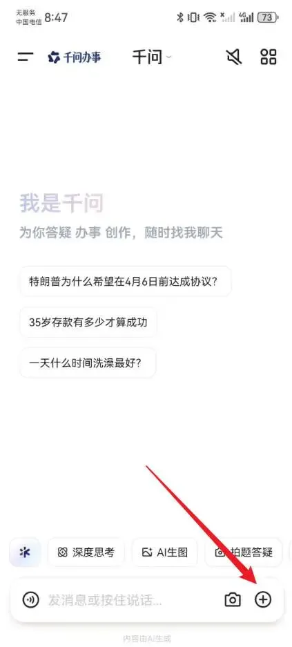 1、在手机上打开千问APP,进入到首页后,点击“+”图标。