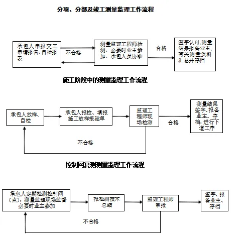 (3)测量:监理人员对承包人的路线放样和有关几何指标进行检查和控制的重要手段。在工程开工前和施工过程中,监理人员应对承包人的线路及结构物放样进行复核,不合格者要求承包人返工,否则不准开工。对已完工程的几何指标,也应该进行测量验收,不合格应要求整修或修正,无法通过整修达到质量要求的工程,应该返工处理;