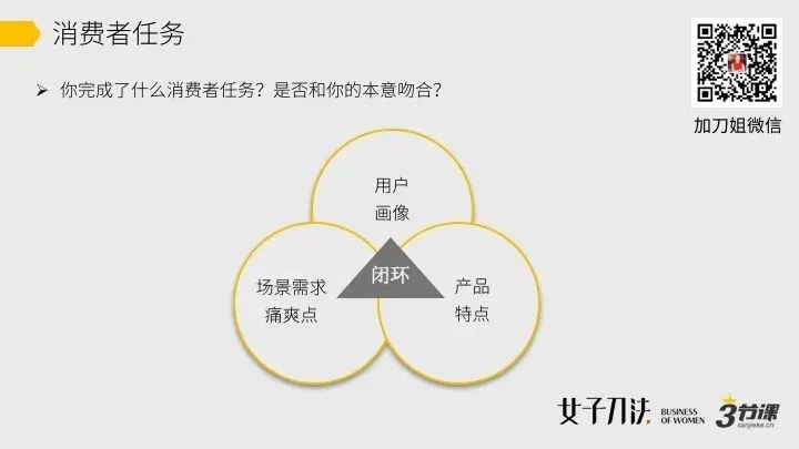 同时我们得了解,消费者今天在这个任务下用的道具是什么?她有没有仍然痛苦的地方(痛点),她想达到的理想状态是什么样(爽点)?为什么你的产品能帮她更好的完成这个任务?