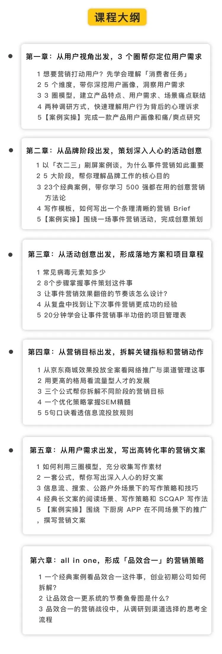 1.我希望新生一代,90后、95后、00后,尤其是那些没有我当年去”营销黄埔军校“培训的机会的,现在在职场上也没有导师教他们的孩子们,能够通过这个课程掌握系统性的方法论,能够打开他们一条新的职场道路。所以我想做一个实战型的课程,不止是打开认知,更是要能上手写出文案、做出创意、做效果投放、做Campaign。