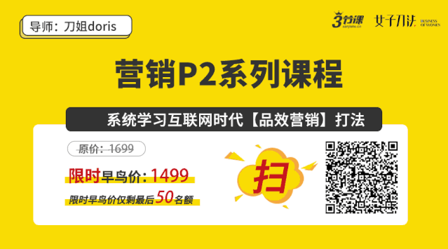 现在《三节课 x 女子刀法营销 P2》系列课程第一期(于8月28日开课)正式开启报名,课程原价 1699 元,现在报名享受早鸟优惠,仅需 1499 元,早鸟优惠名额现在所剩无几,每上升100人就会涨价一次。因此,话不多说,赶紧扫描下方图片二维码抢占座位吧!