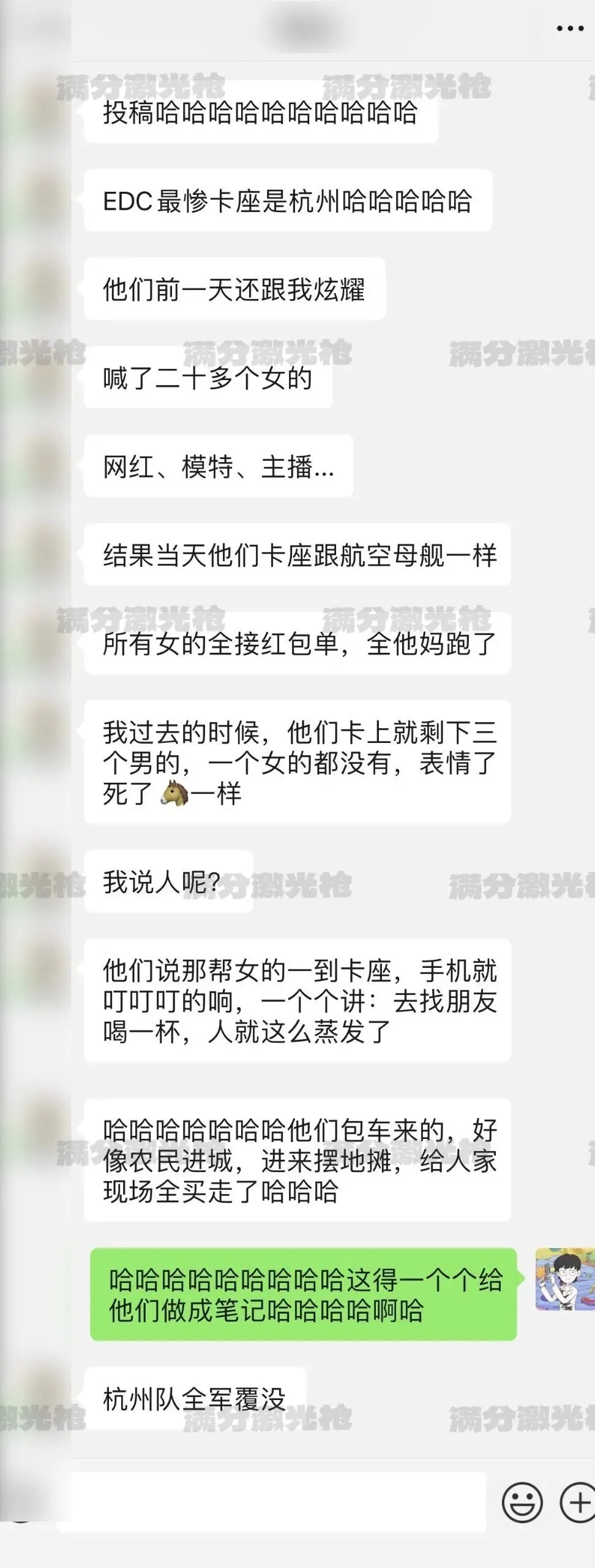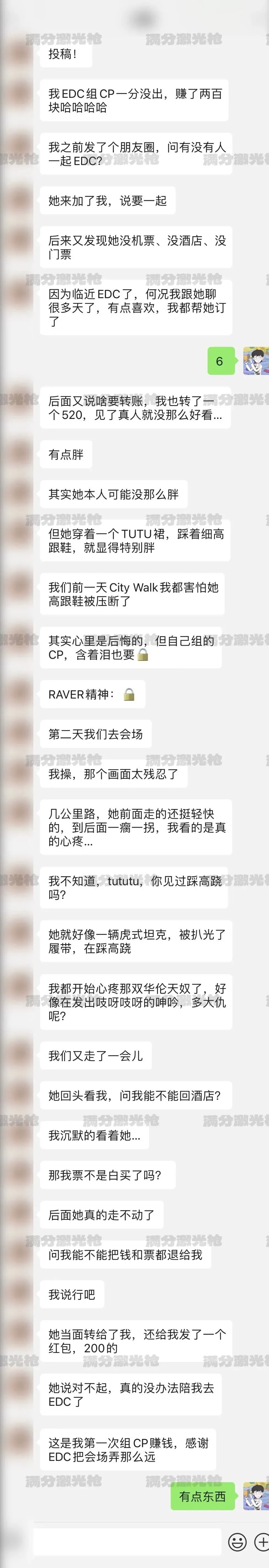 苏州EDC吃瓜合集.PDF 前几天我好奇这次苏州EDC为啥没什么有意思的瓜? 评论区终于有人站出来解答: 但我在后台还是收到了些有趣的、琐碎的瓜,挑几个拿出来给大家看个乐子。 🥱 累到照骗CP退钱 👹 去EDC被老姨夫拉黑 🏥 喝了一杯酒A五千块 😣 杭州队惨遭滑铁卢 ♿️ 轮椅女背后故事令人心酸 能让我觉得好玩的瓜就这么些了! 还有一个捞女偷偷出来玩被大哥抓包的瓜,因为是熟人投稿的,就不放出来了。 想看的朋友在后台回复“抓包”,就可以看到了。 如果大家在EDC有特好玩的见闻,欢迎在评论区继续补充…