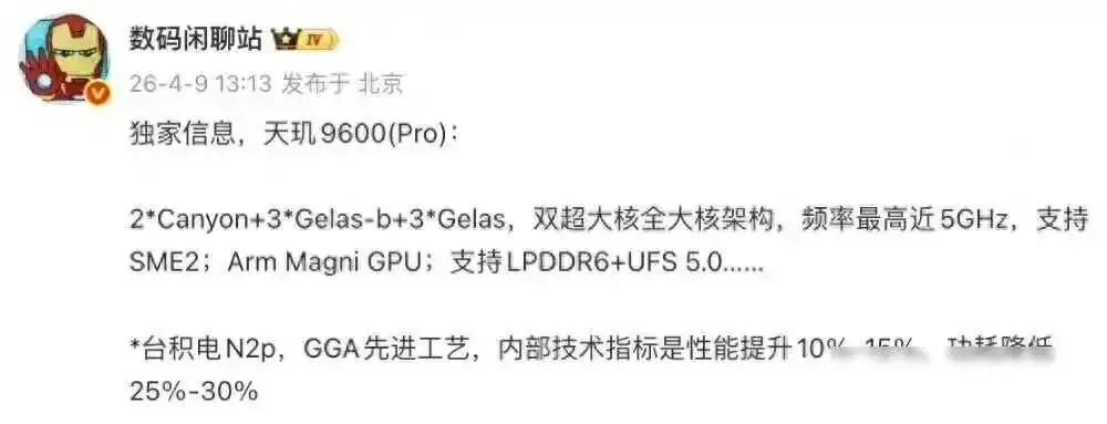 2026年4月,vivo X500系列还有五个月就要发布,它要首发的天玑9600芯片主频已经接近5GHz,这个数字听起来很厉害,但关键不是它有多快,而是它不像以前那样一跑就发热,联发科这次用上了新架构,包括两个超大核、三个大核和三个中核,分别属于Canyon和Gelas系列,台积电的N2p工艺也帮了大忙,逻辑密度提高了1.2倍,在同样功耗下性能能提升18%,在同样速度下功耗能降低36%,总之就是现在不用在速度和散热之间做选择了。