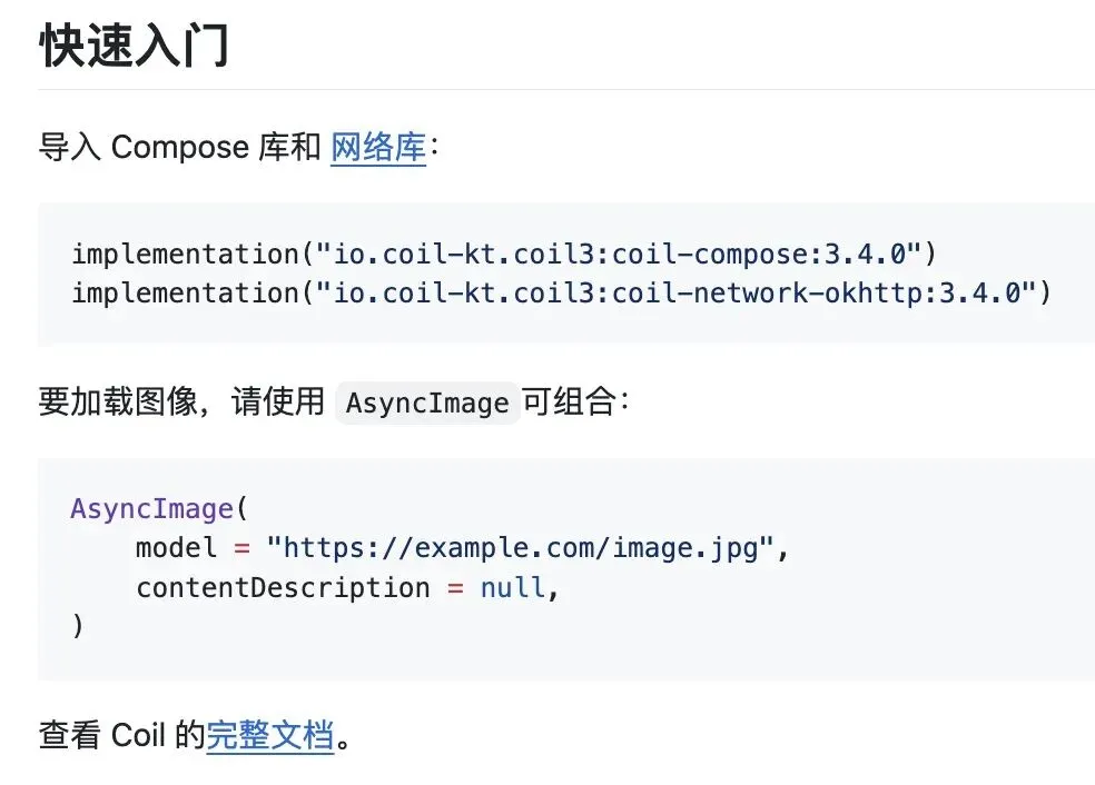 因为项目中有从服务器拉取用户头像并显示的需求,在这里我们直接使用 Coil 库来实现它。Coil 原生支持 Compose,所以我们可以直接使用 Coil 中的 AsyncImage 和 SubcomposeAsyncImage 组件。