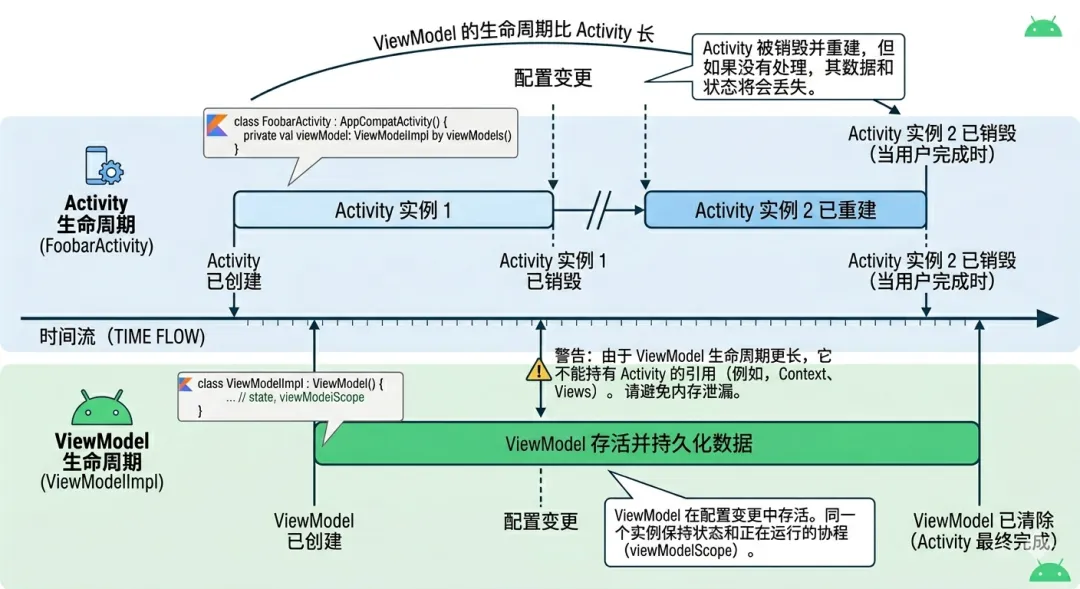 ViewModel 正好承担了这个职责:它能延长数据的生命周期,避免因为旋转屏幕或其他原因导致 Activity 重建时数据丢失,同时也提供了 viewModelScope 让协程与数据流有清晰的归属。