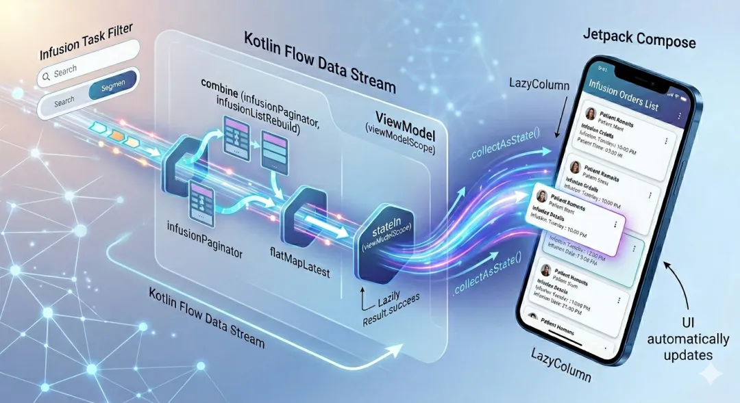 val infusionListUpdated = _infusionListUpdated.asSharedFlow()val infusionTaskFilter = MutableStateFlow(InfusionTaskFilter())val infusionList = infusionPaginator.combine(infusionListRebuild) { it, _ -> it }.flatMapLatest { flow { emit(it.map { it?.list }) } }.stateIn( scope = viewModelScope, Lazily, Result.success(null) )