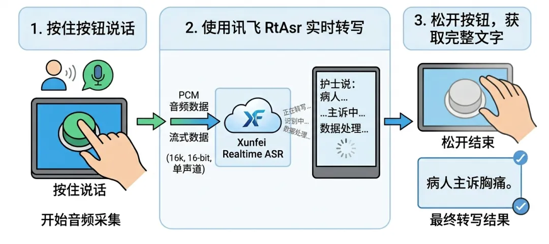 因为我们在界面中需要做一个按钮,让护士可以像对讲机一样按住该按钮用语音给 AI 下达命令,所以我们需要做出录音实时转写的模块,在这里我们直接使用讯飞开放平台提供的 Realtime ASR。