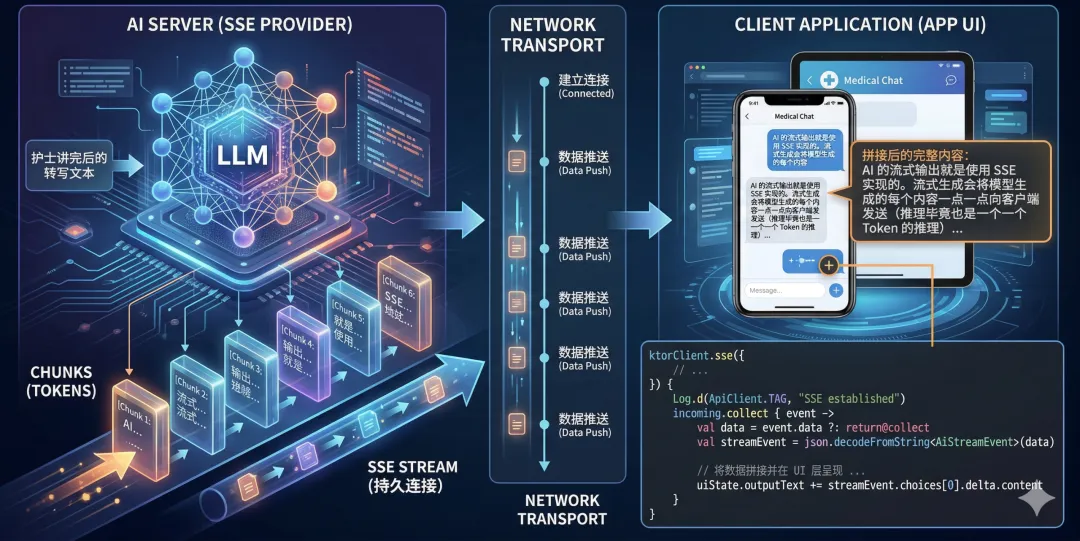 val ktorClient = HttpClient(CIO) { install(SSE)}// ...ktorClient.sse({ method = HttpMethod.Post url("$apiRoot/*****") contentType(ContentType.Application.Json) setBody(payload) header("Authorization", "Bearer ******")}) { Log.d(ApiClient.TAG, "SSE established") incoming.collect { event -> val data = event.data ?: return@collect val event = json.decodeFromString<AiStreamEvent>(data) // 将数据拼接并在 UI 层呈现 ... }}