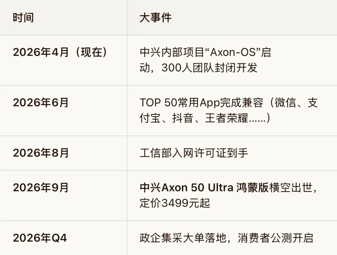 时间点:2026年9月,中兴将发布国内第一款搭载开源鸿蒙(OpenHarmony)的商用手机。如果预测成真,这将是安卓阵营的“第一滴血”。