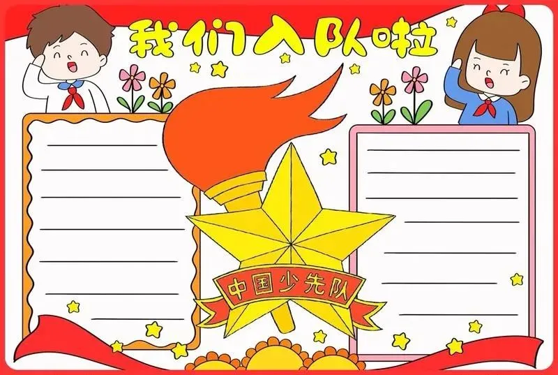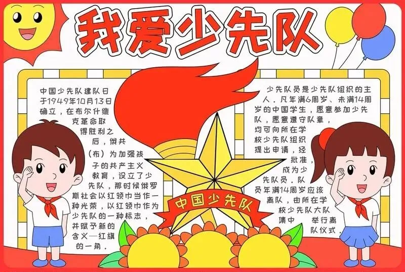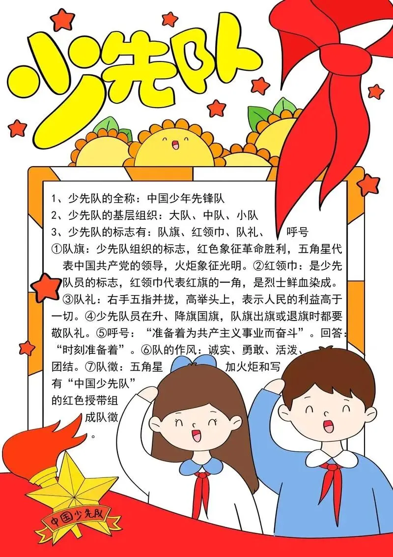 1. 种类与含义:队旗是少先队组织的标志,包括大队旗和中队旗。大队旗长120厘米、高90厘米,旗中心是五角星和火炬,五角星代表中国共产党的领导,火炬象征光明。中队旗长80厘米、高60厘米,右端剪去高20厘米、底宽60厘米的等腰三角形,形成一个缺口,这是为了方便队伍行进时展示。队旗寓意着在中国共产党的领导下,向着光明的未来前进。