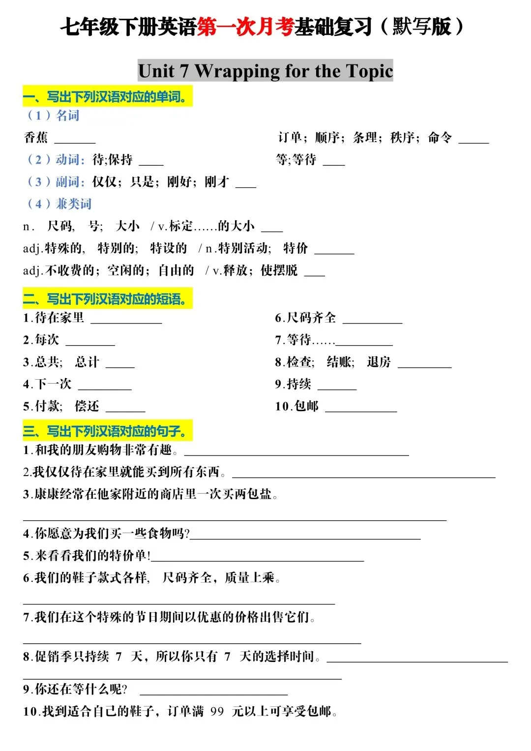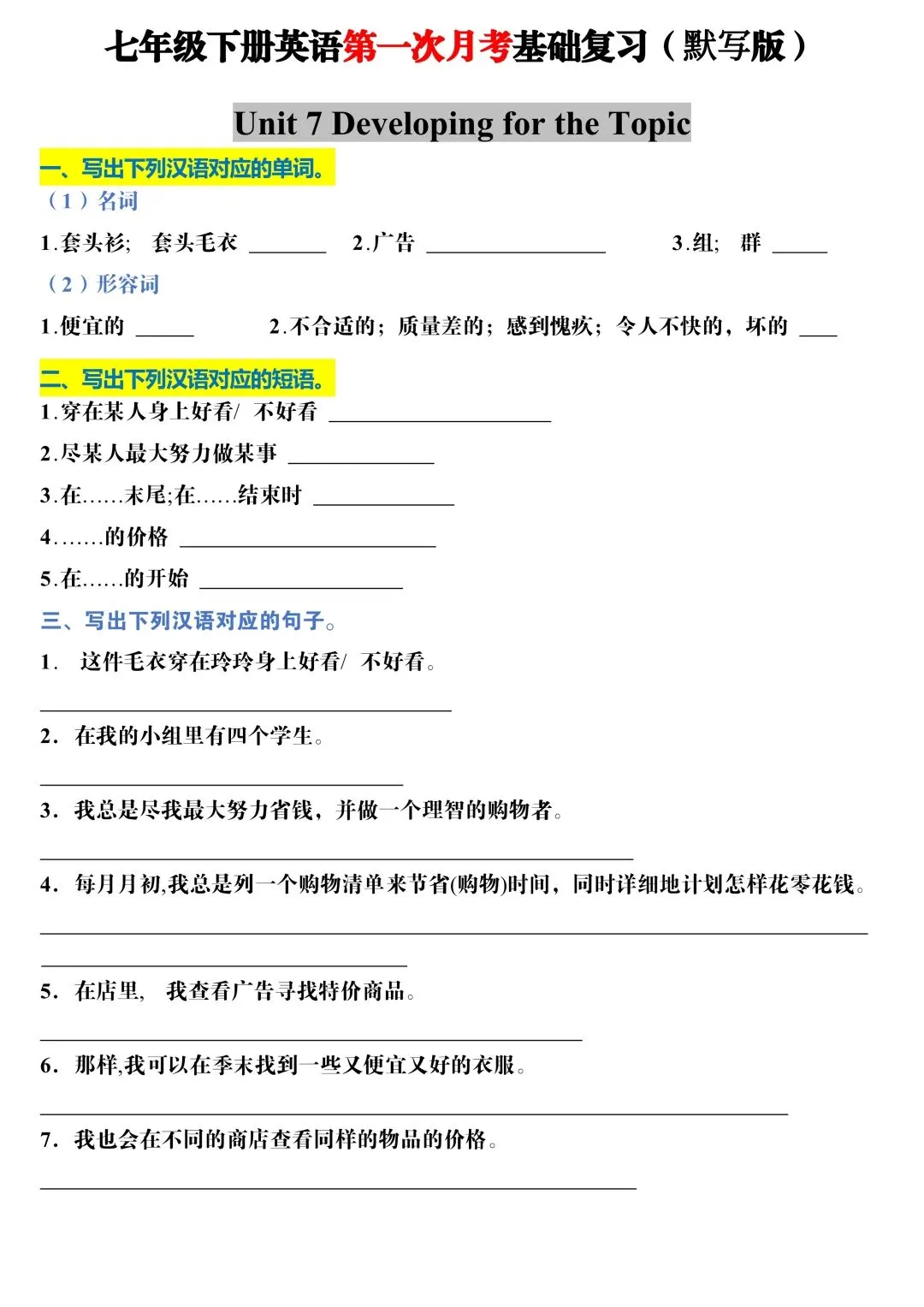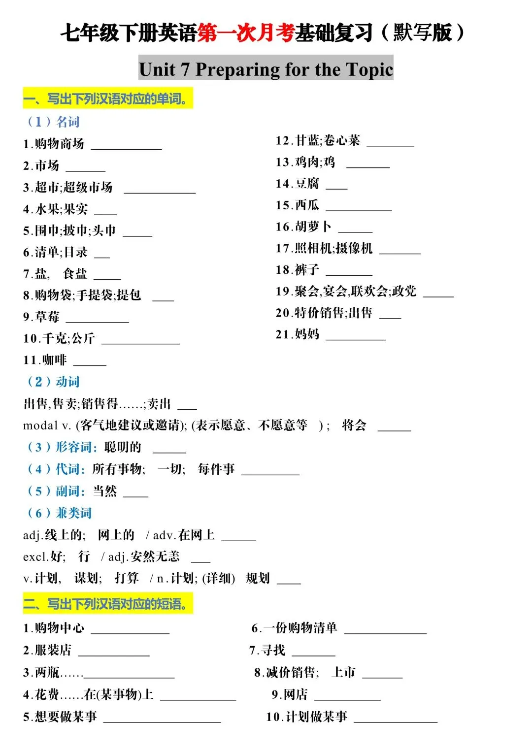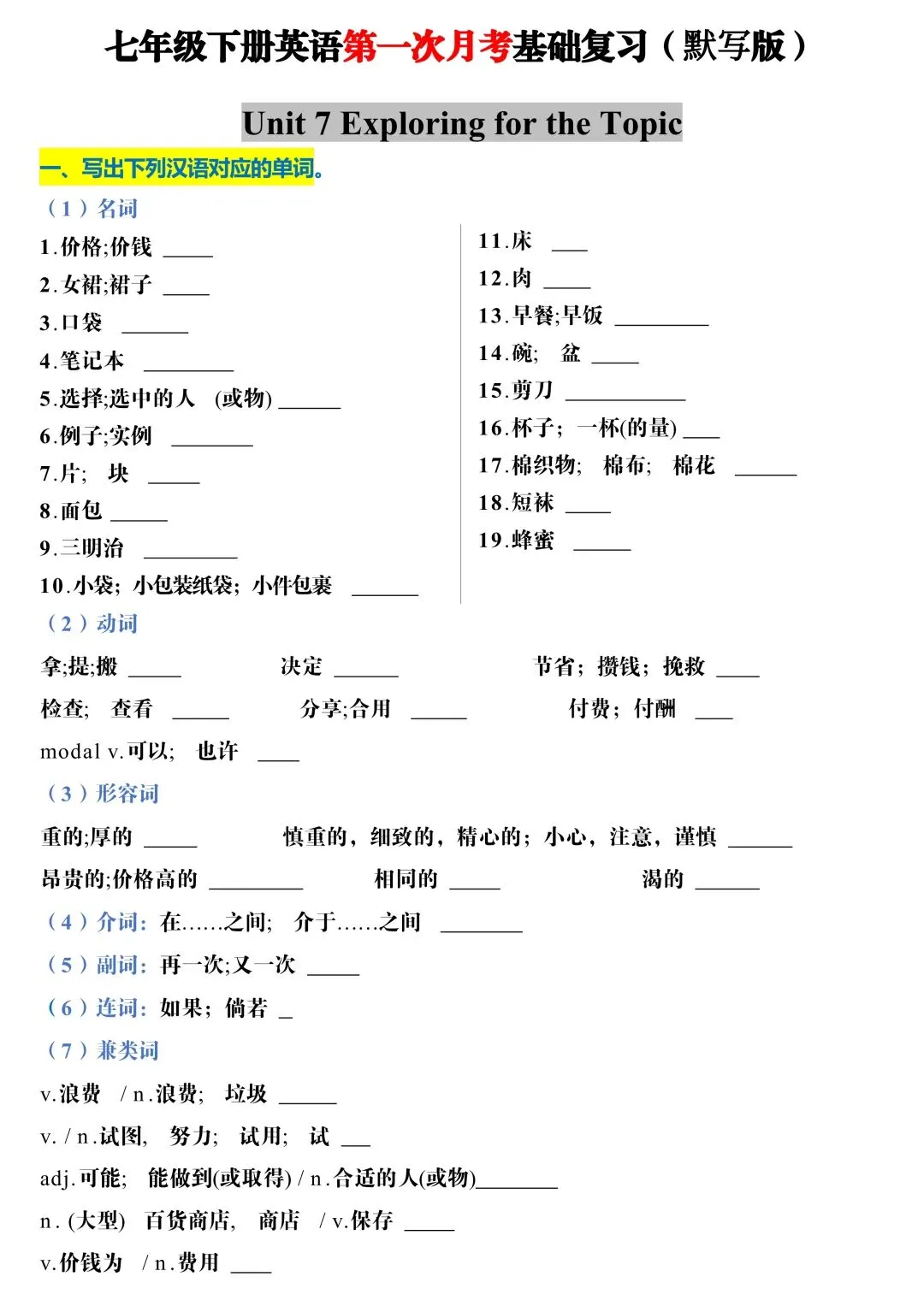 26年春七年级初一下学期仁爱版英语第一次月考基础复习(早背晚默)共16页丨高清可打印(330)