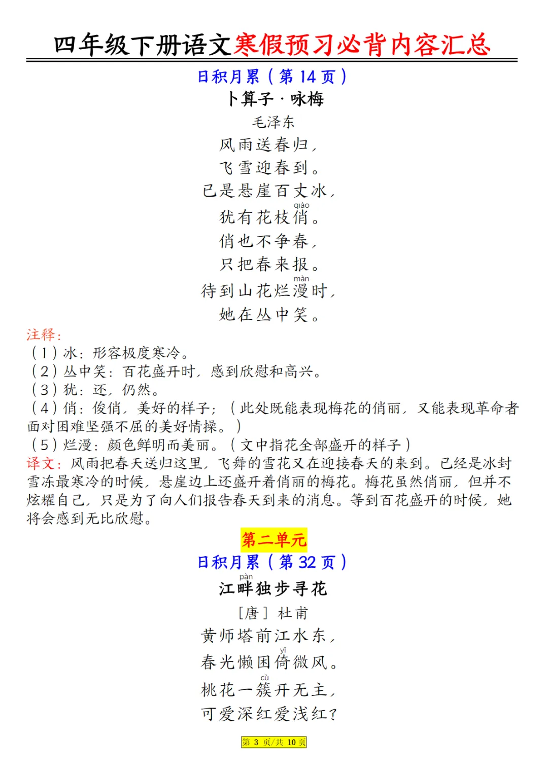 四年级下语文课文必背内容汇总 电子版可打印