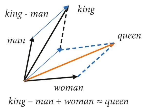这个式子告诉我们,“国王” 中去除 “男人” 的含义后,再加上 “女人” 的含义,可以大致得到 “女王” 这个词的含义。
