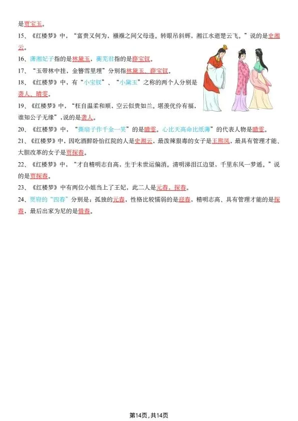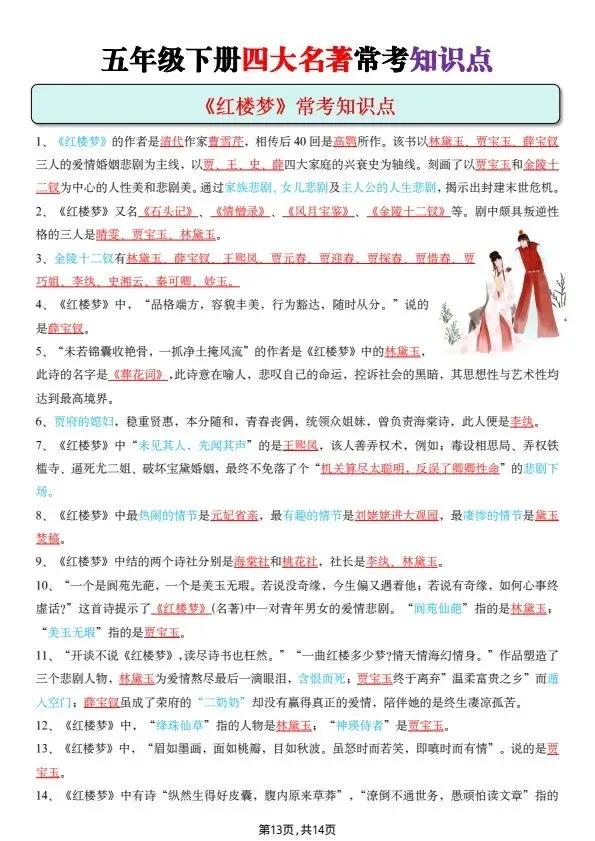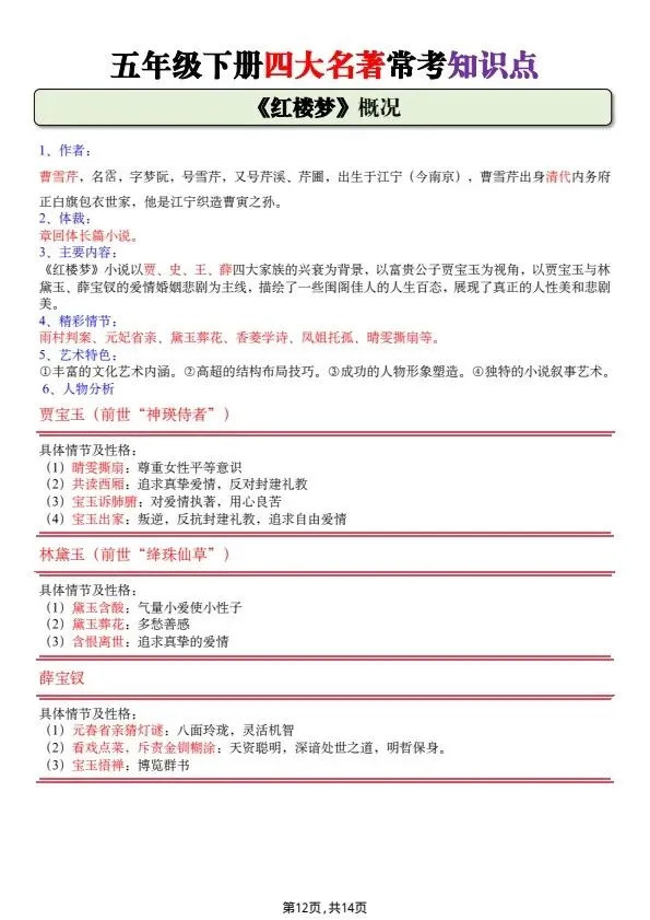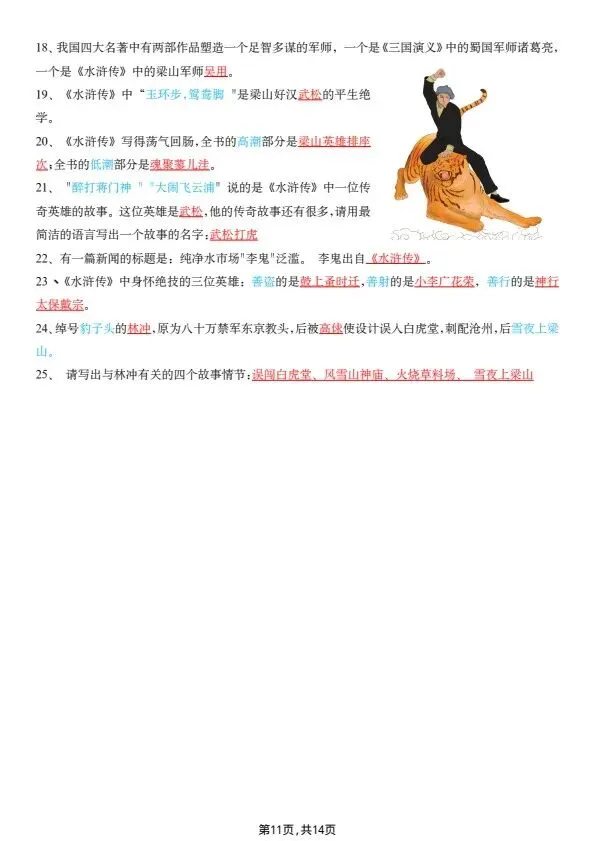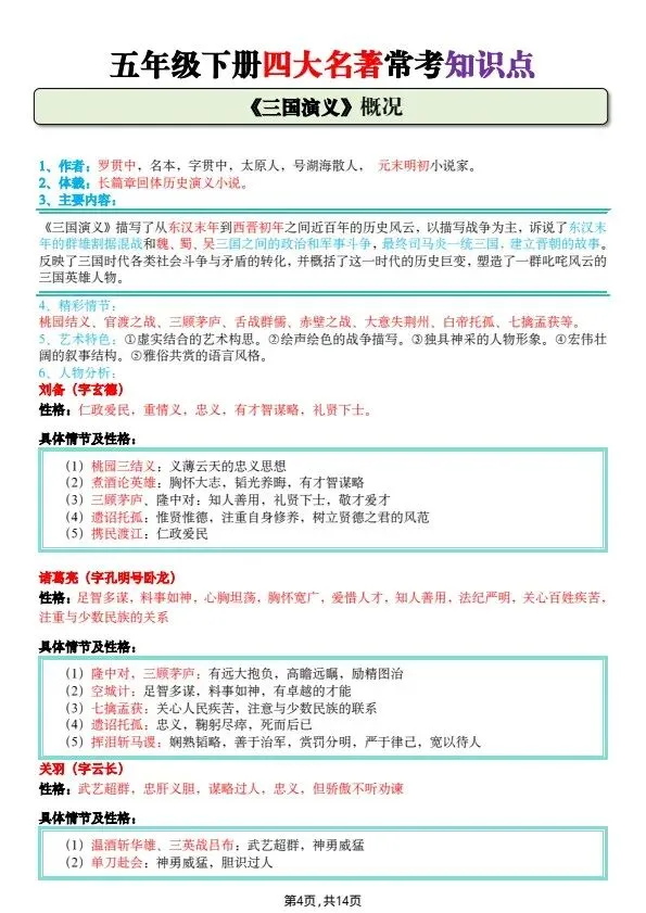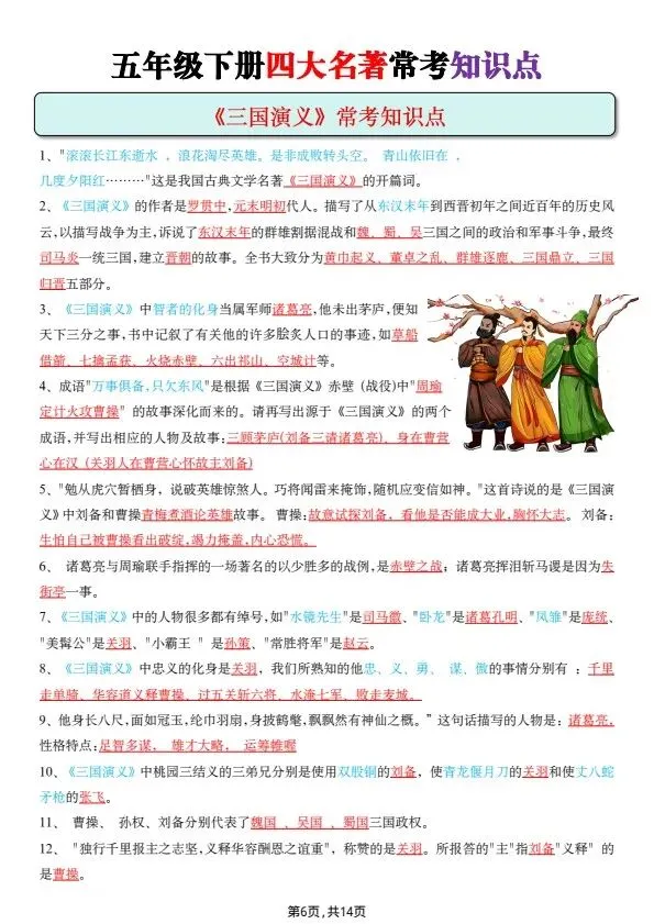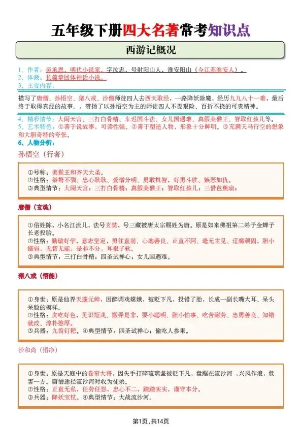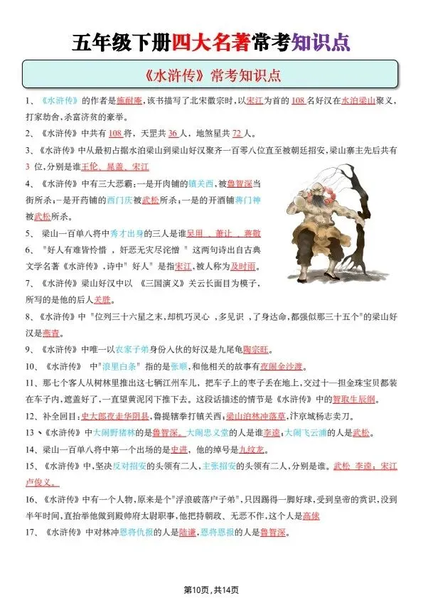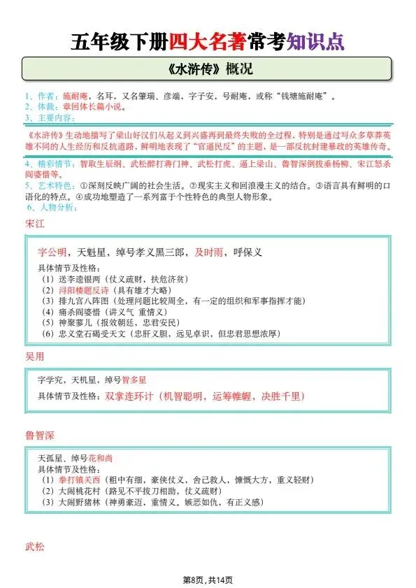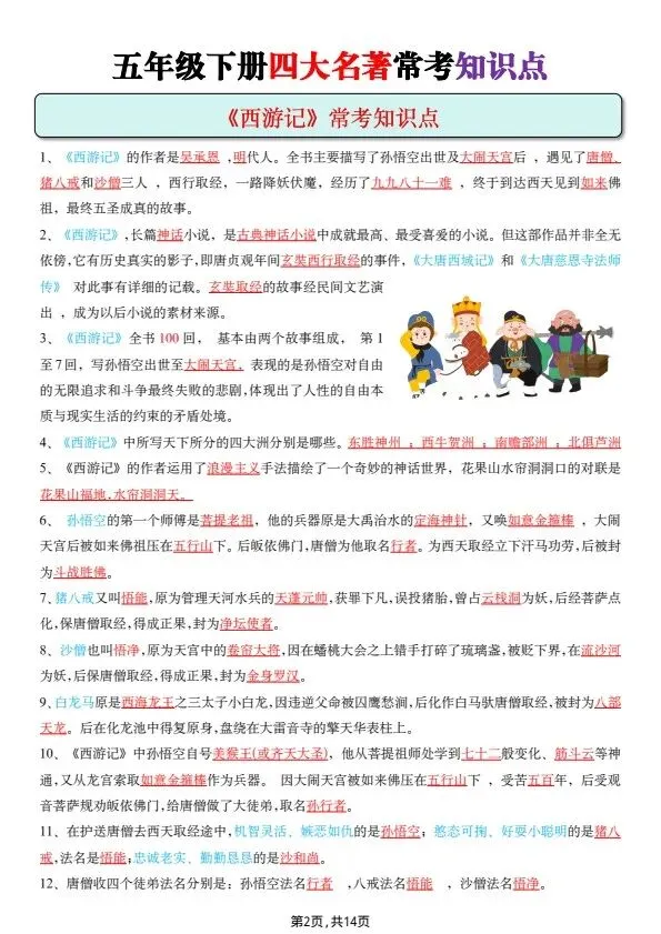 五年级下册四大名著常考知识点(完整电子版可打印)