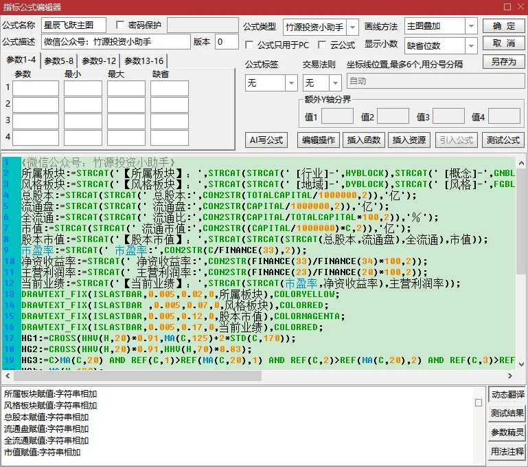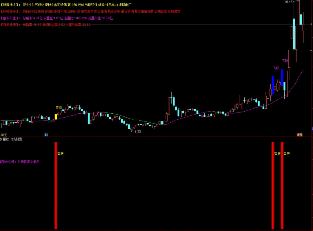 DRAWTEXT_FIX(C>O,0,0.2,0,’微信公众号:竹源投资小助手’),COLORMAGENTA;