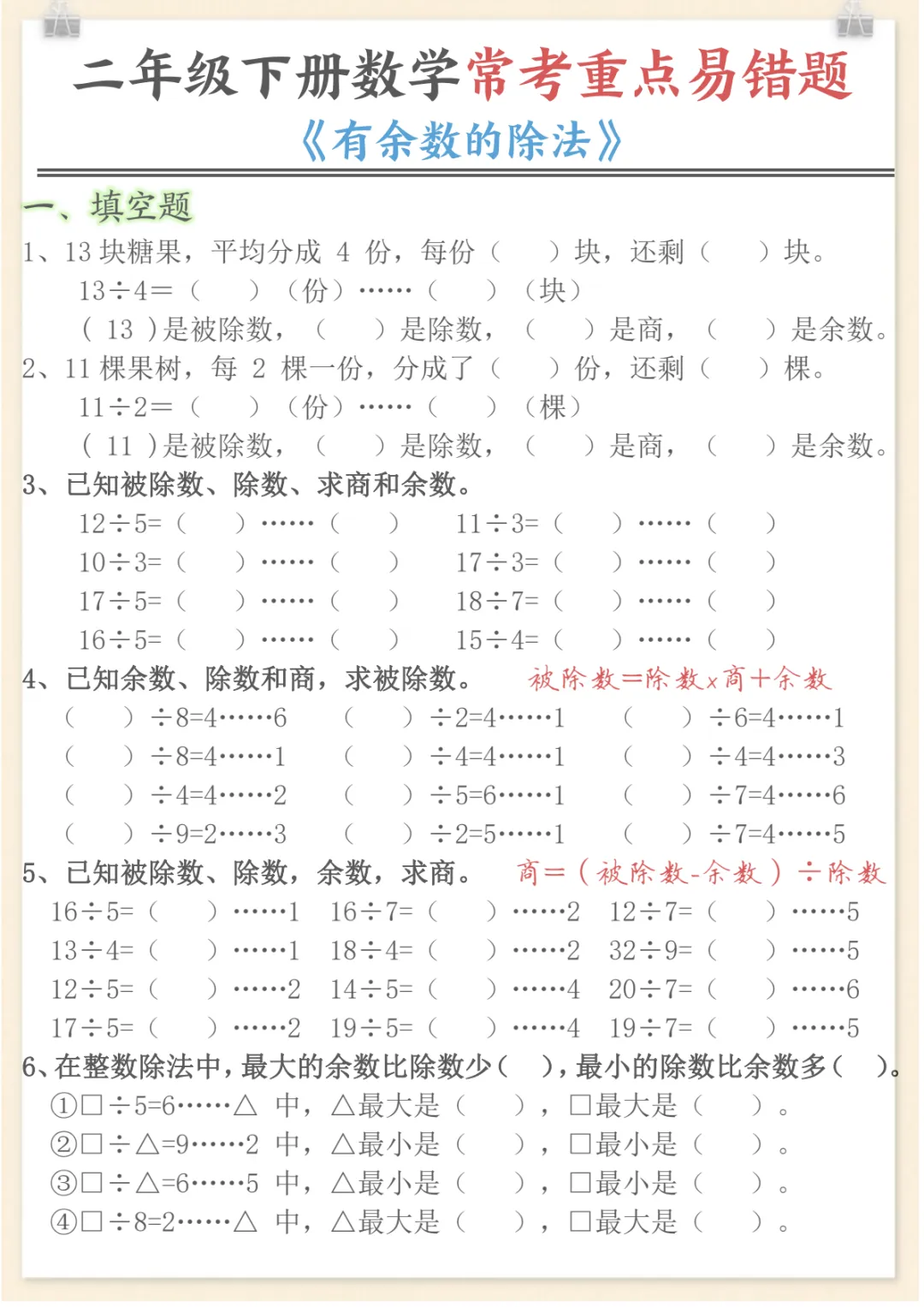 二年级下数学有余数的除法 重点易错题,电子版可打印