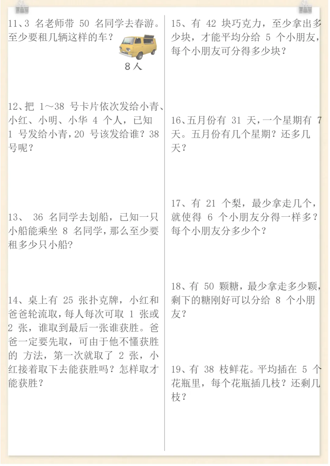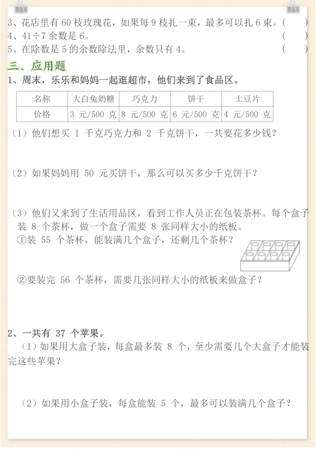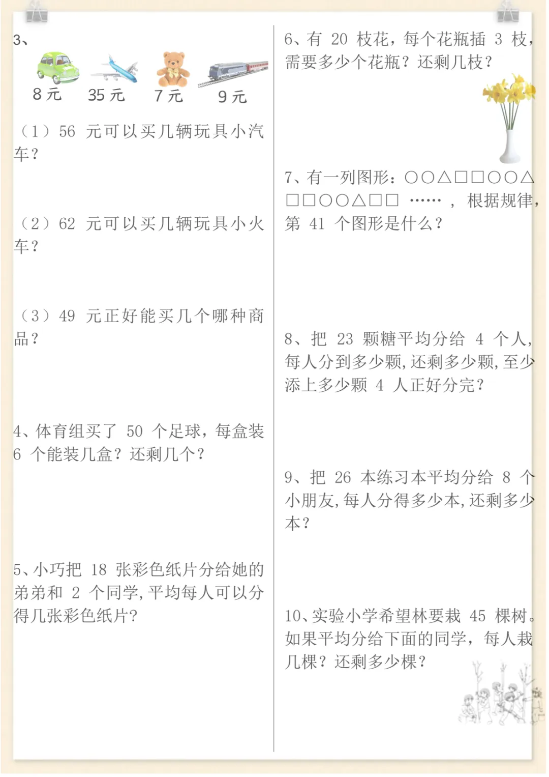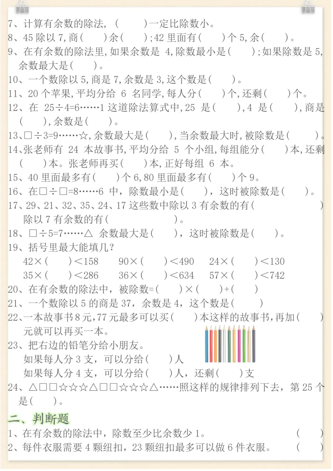 二年级下数学有余数的除法重点易错题,共12页,电子版可下载可打印,这份专项练习紧扣二年级下册有余数的除法学习内容,涵盖除法意义理解、商和余数的判断、竖式计算、根据题意灵活列式以及常见易错点辨析等训练,帮助孩子在练习中进一步巩固基础、查漏补缺,系统强化这一单元的重点与难点。需要的家长可以及时下载打印出来,让孩子认真练一练。