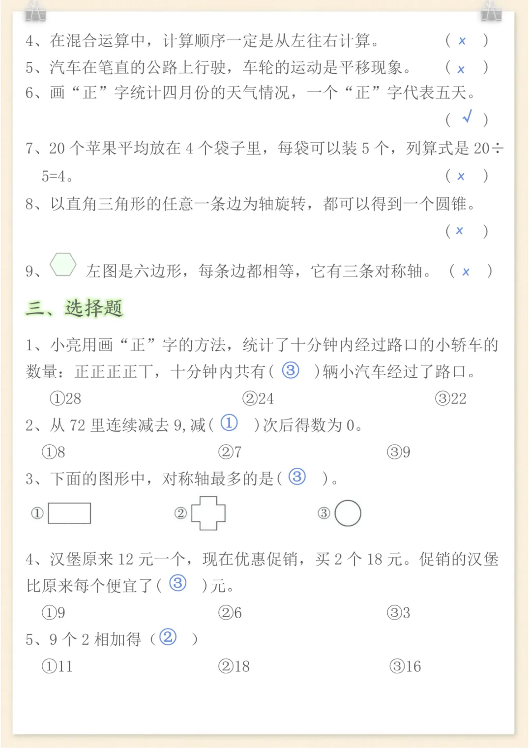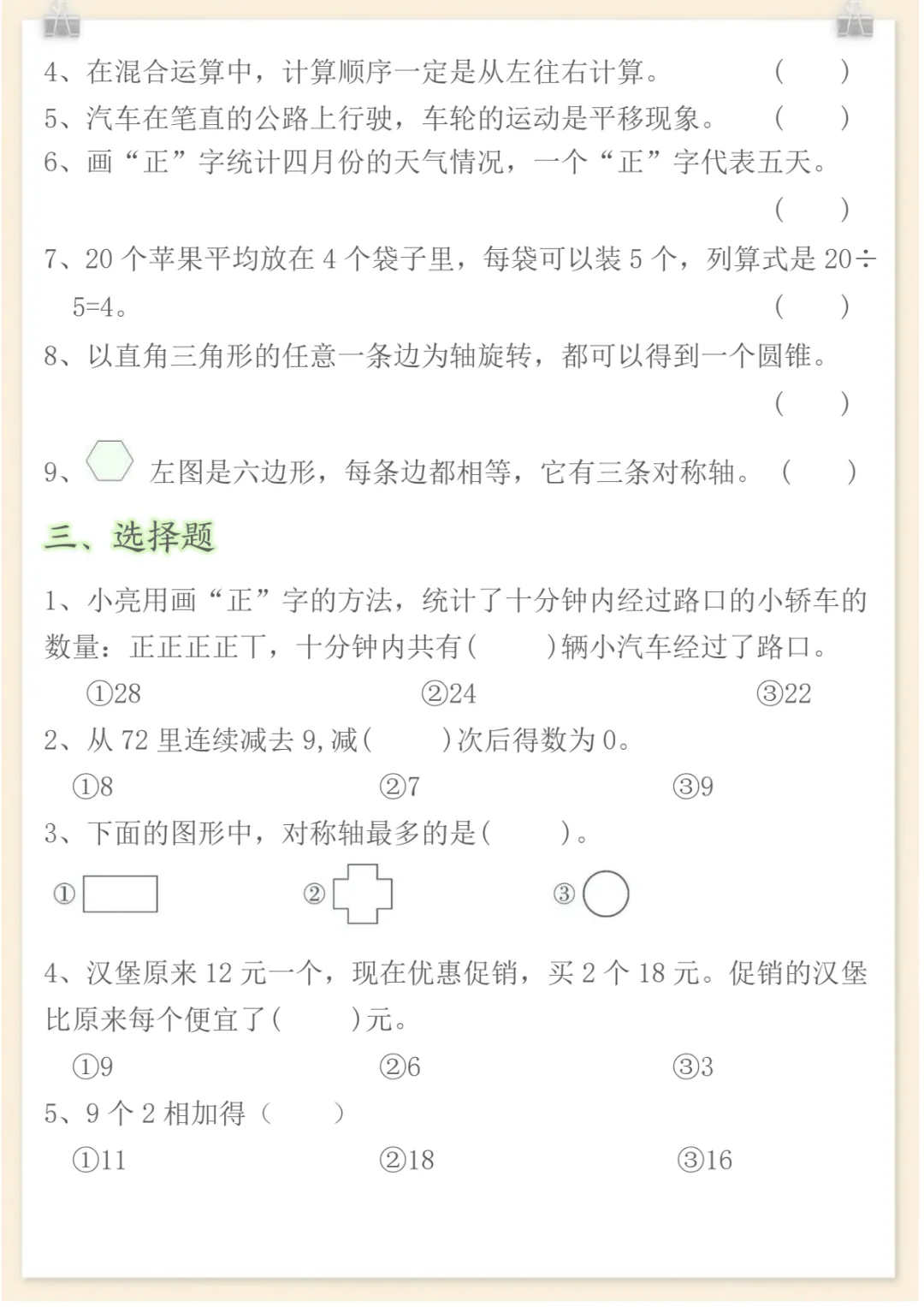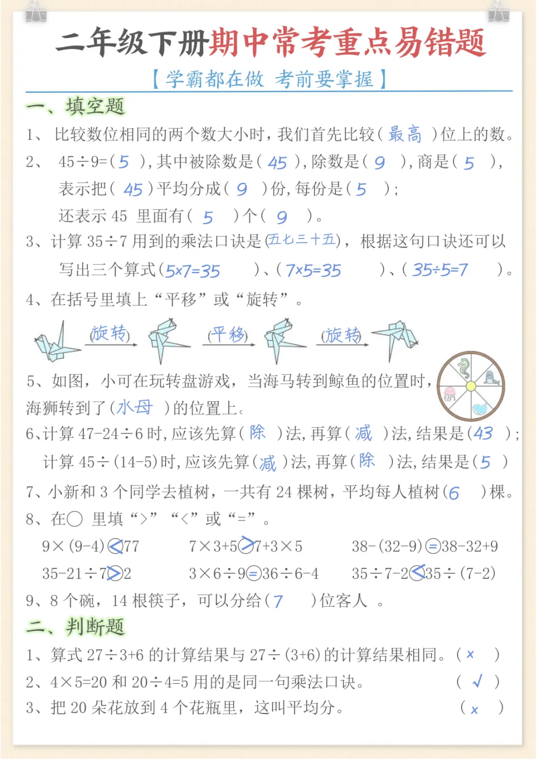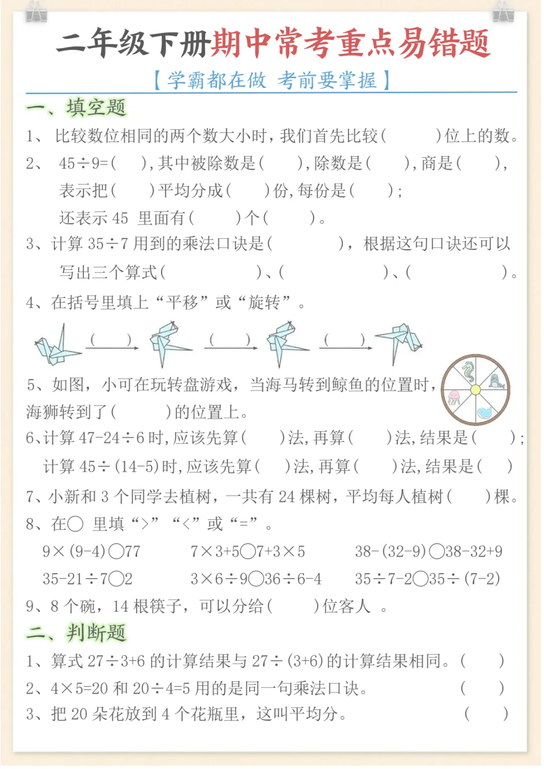 二年级下数学期中常考重点易错题,共8页,电子版可下载可打印,这份资料围绕二年级下册数学期中阶段的常考内容与易错题型进行整理,涵盖多个核心知识点与专项训练内容,帮助孩子在练习中查漏补缺、巩固基础、提升解题准确率。对于想在期中前帮孩子做好复习、抓住重点难点的家长来说,这份资料很实用,建议尽快下载打印出来,让孩子及时练一练。