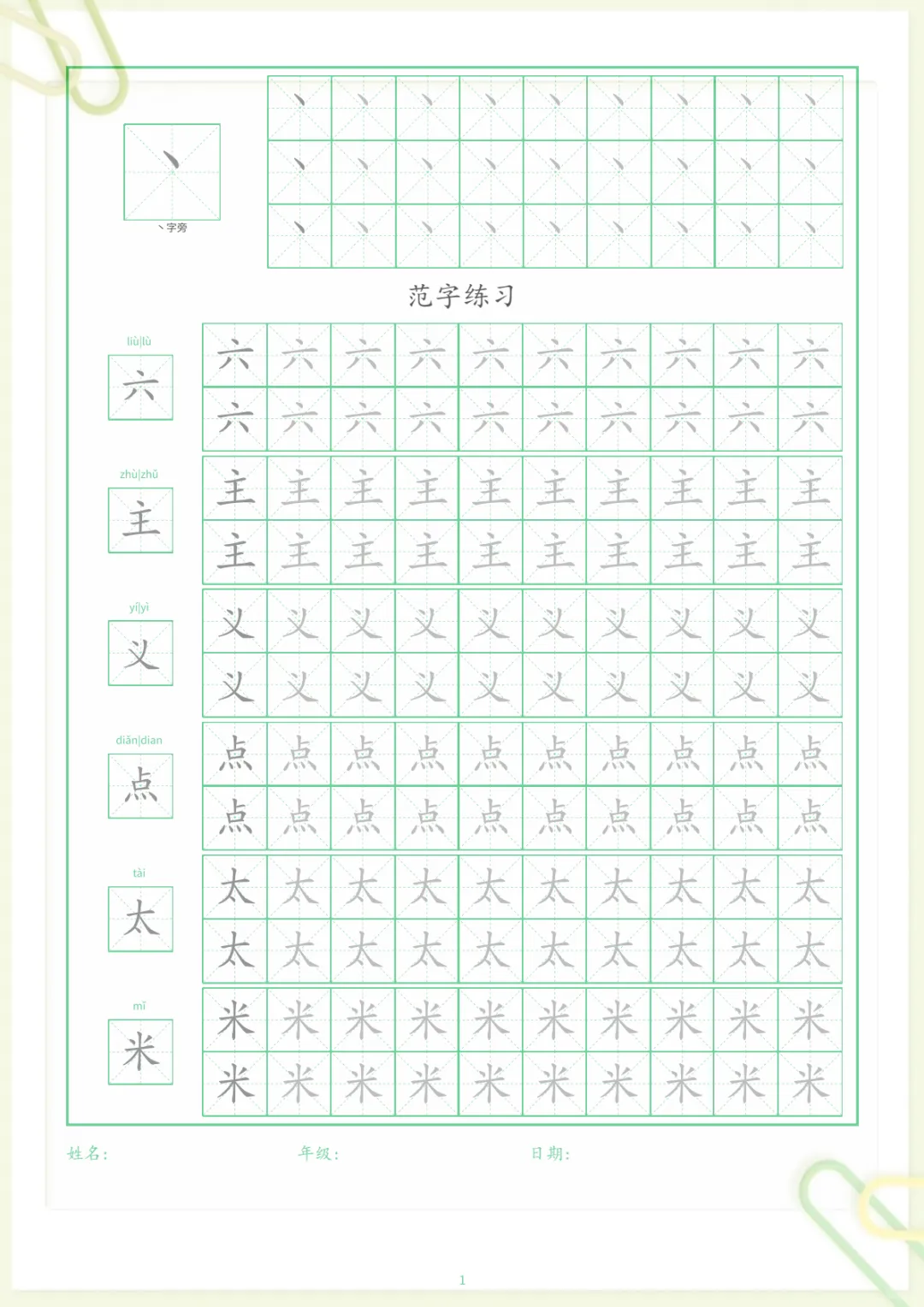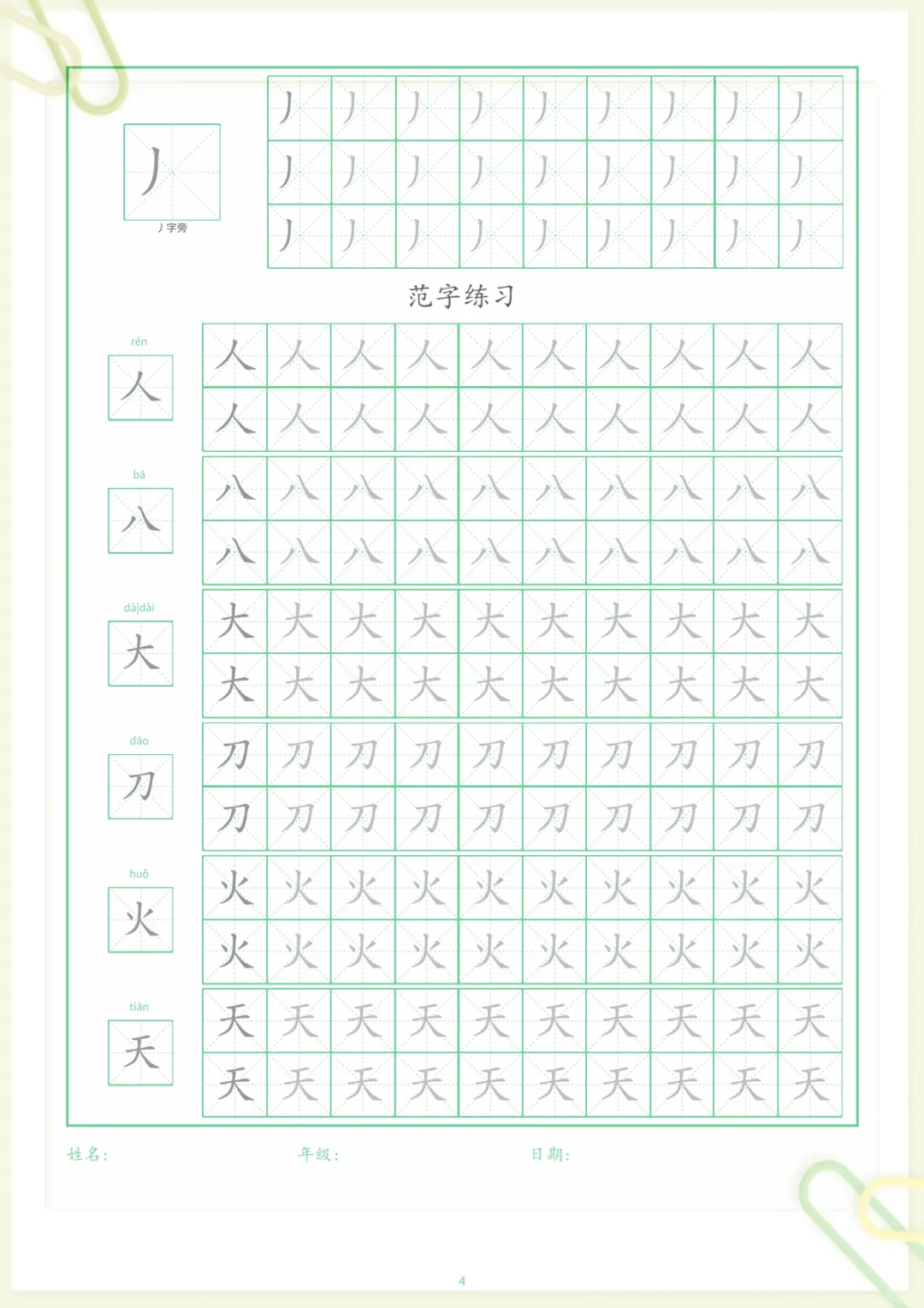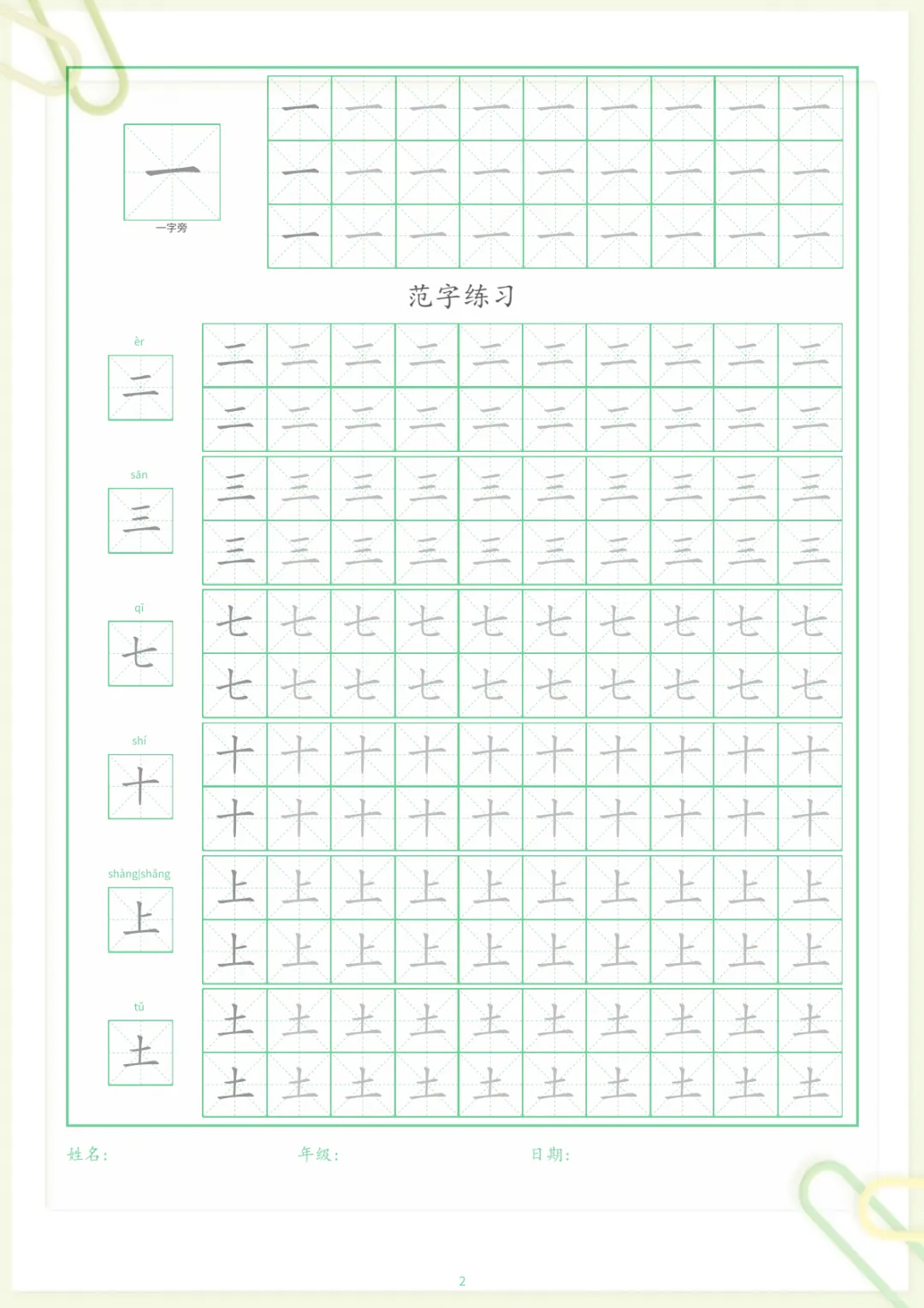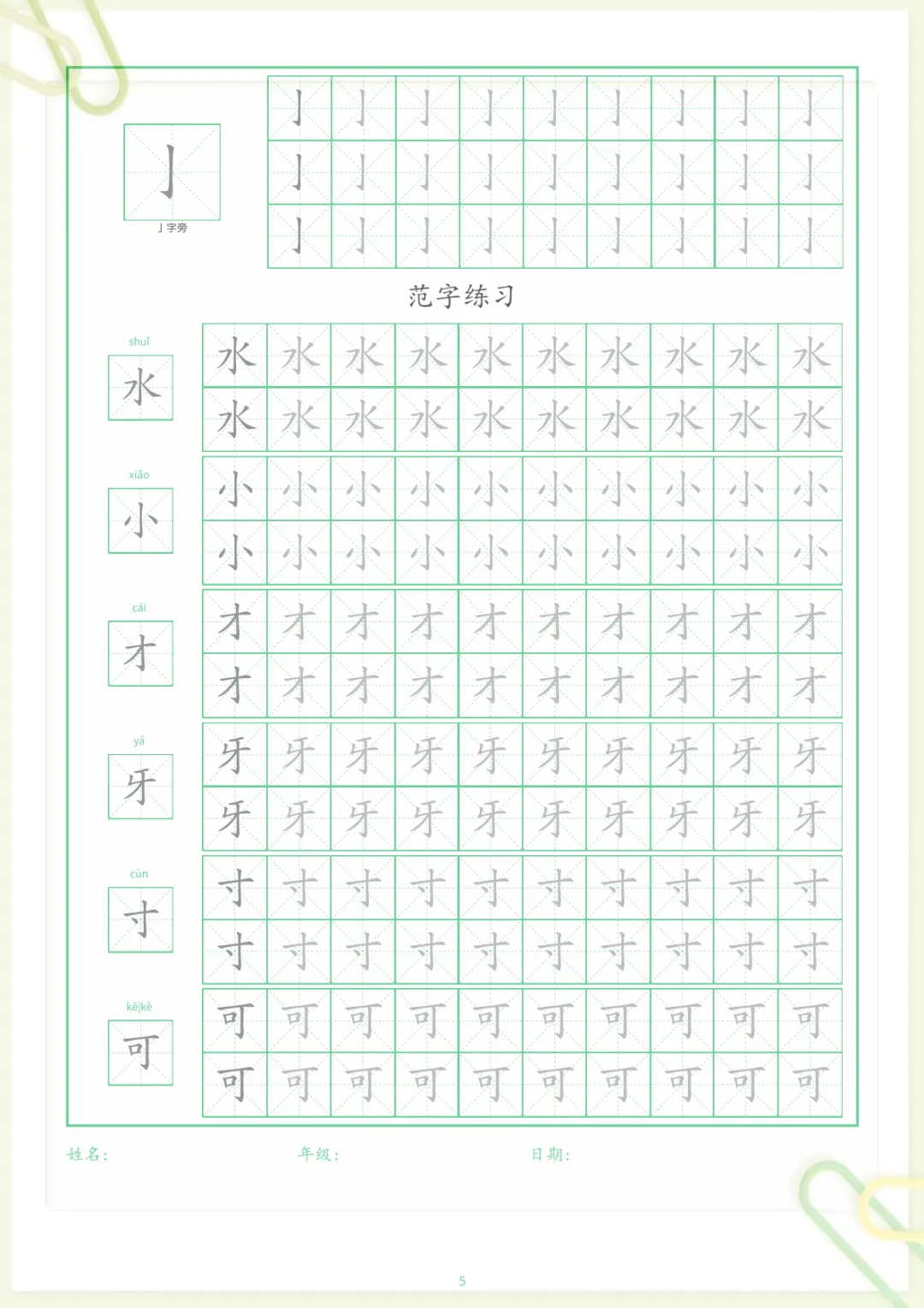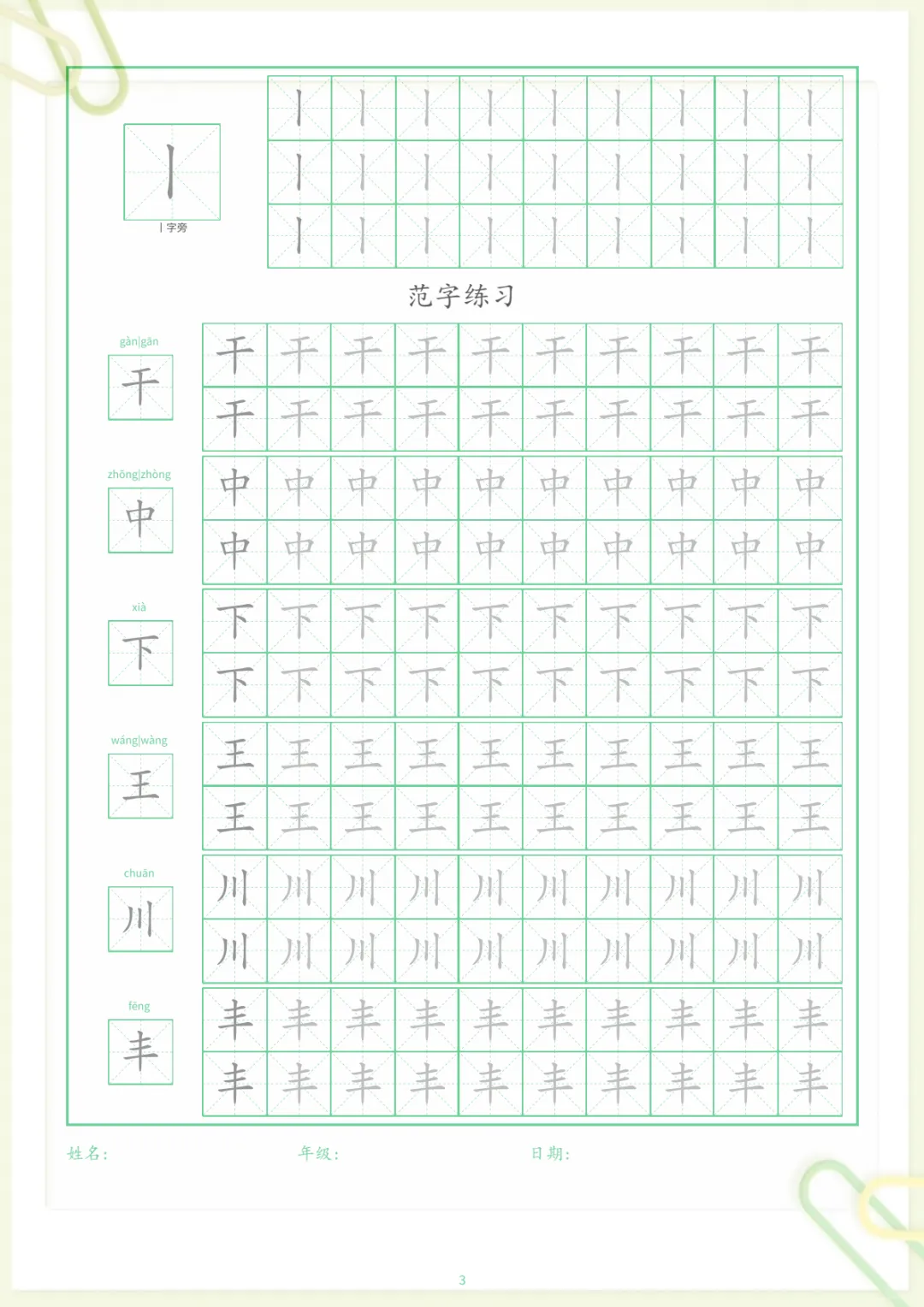 笔画笔顺范字练习,共5页,电子版可下载可打印,这份幼小衔接专项练习资料围绕基础书写训练展开,帮助孩子熟悉常见笔画名称、正确笔顺规则以及范字书写要点,在练习中逐步建立规范书写意识,为后续识字与写字打好基础。内容精炼实用,适合家长在家陪练,需要的家长可以及时下载打印出来,让孩子练一练。
