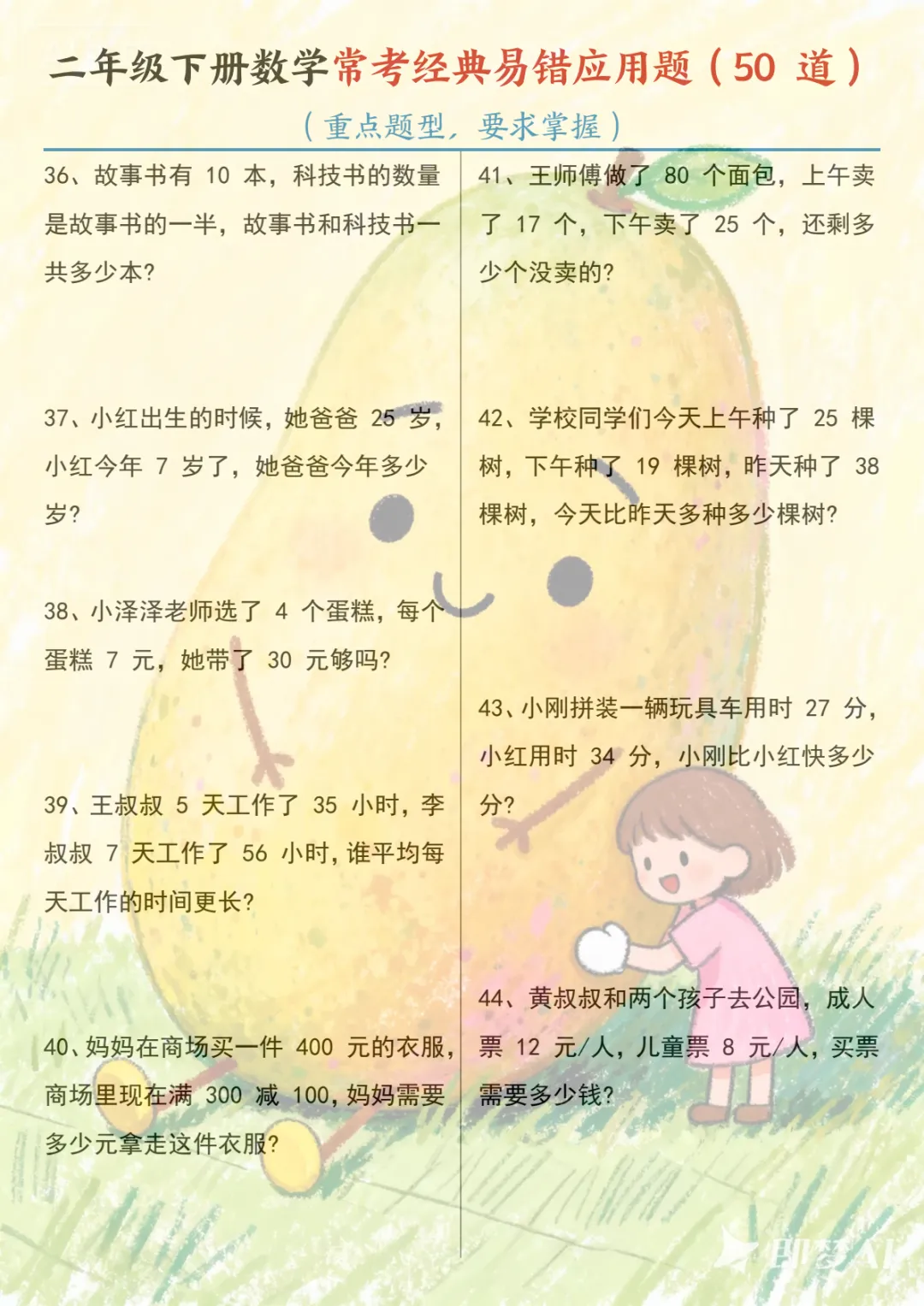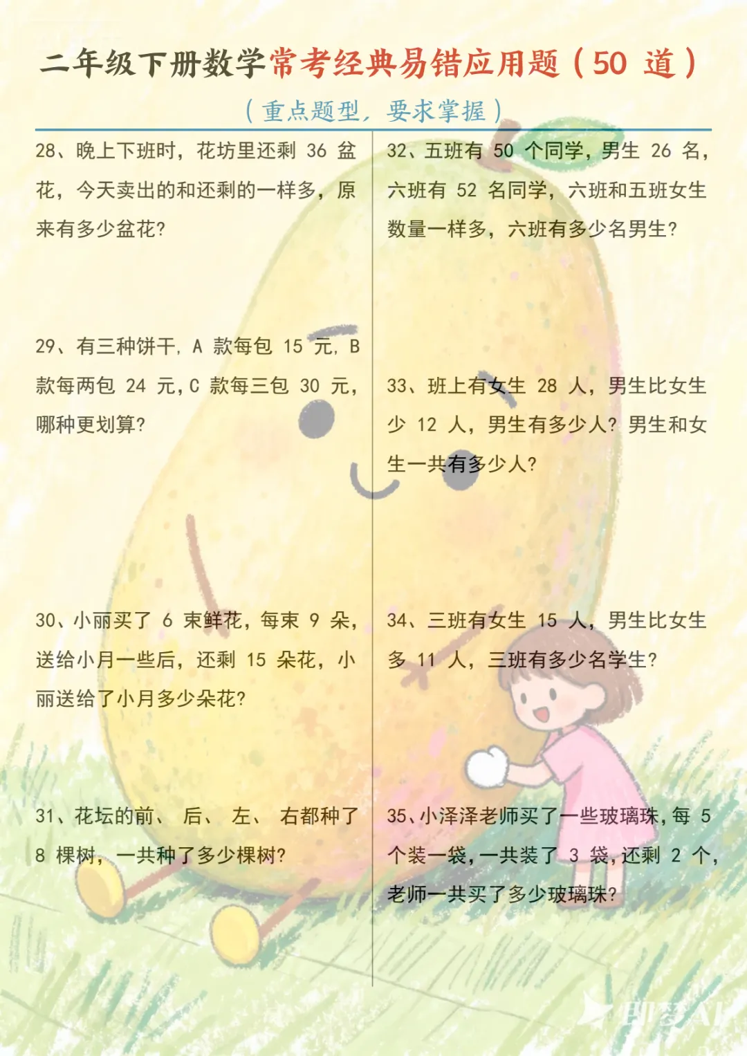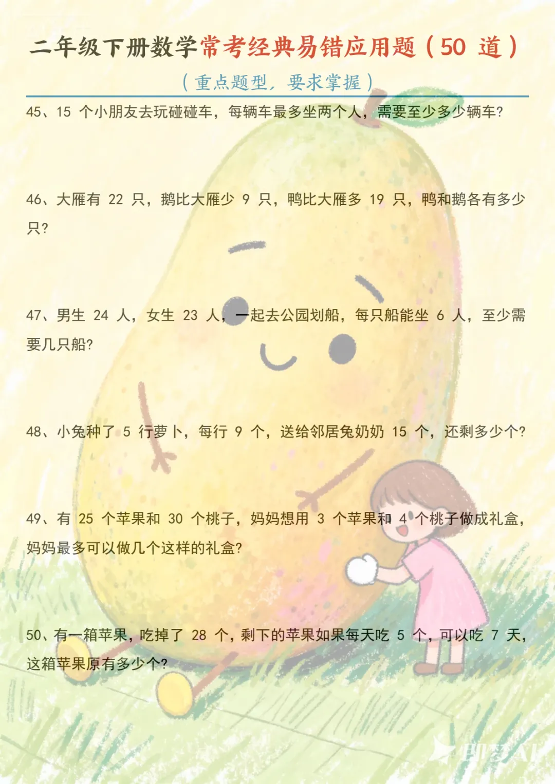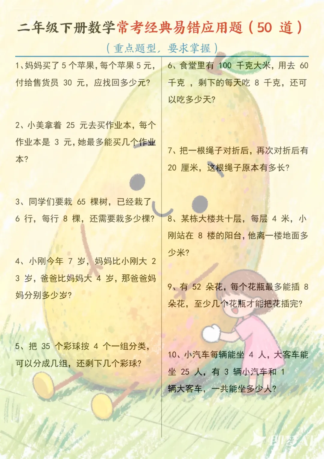 二年级下数学常考经典易错应用题50道,电子版可打印