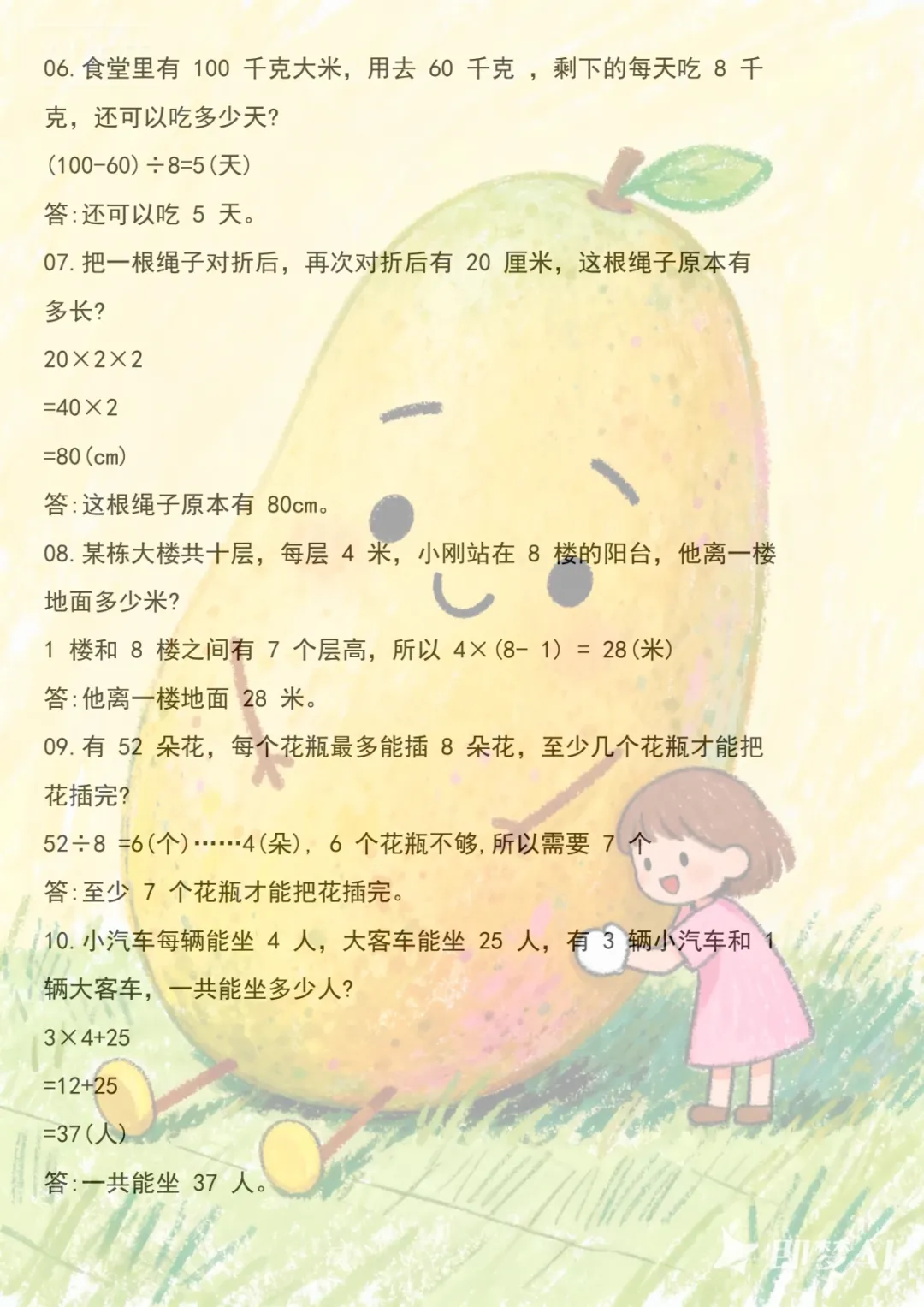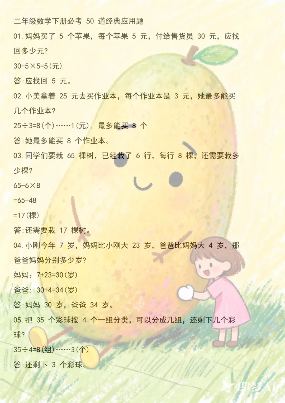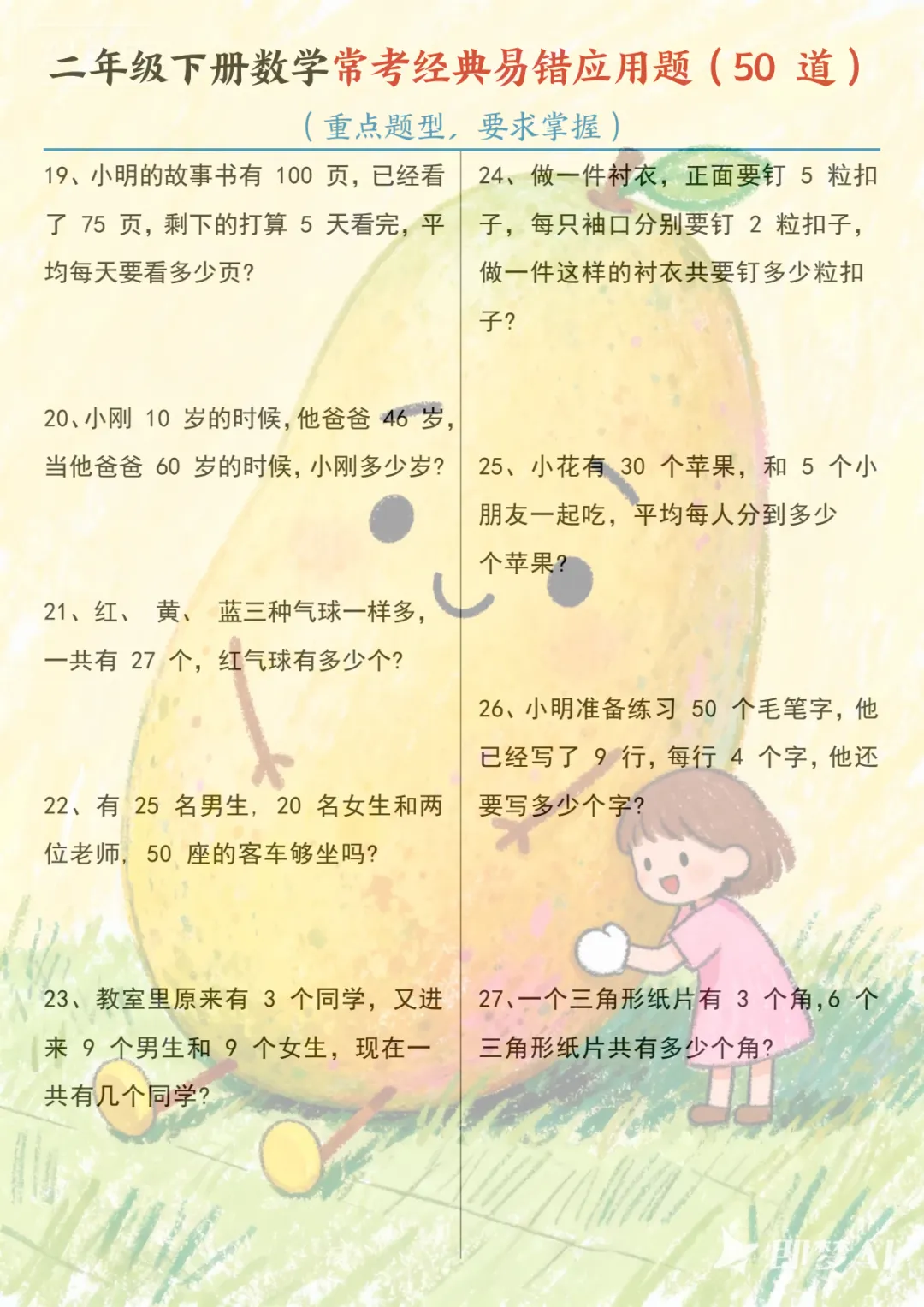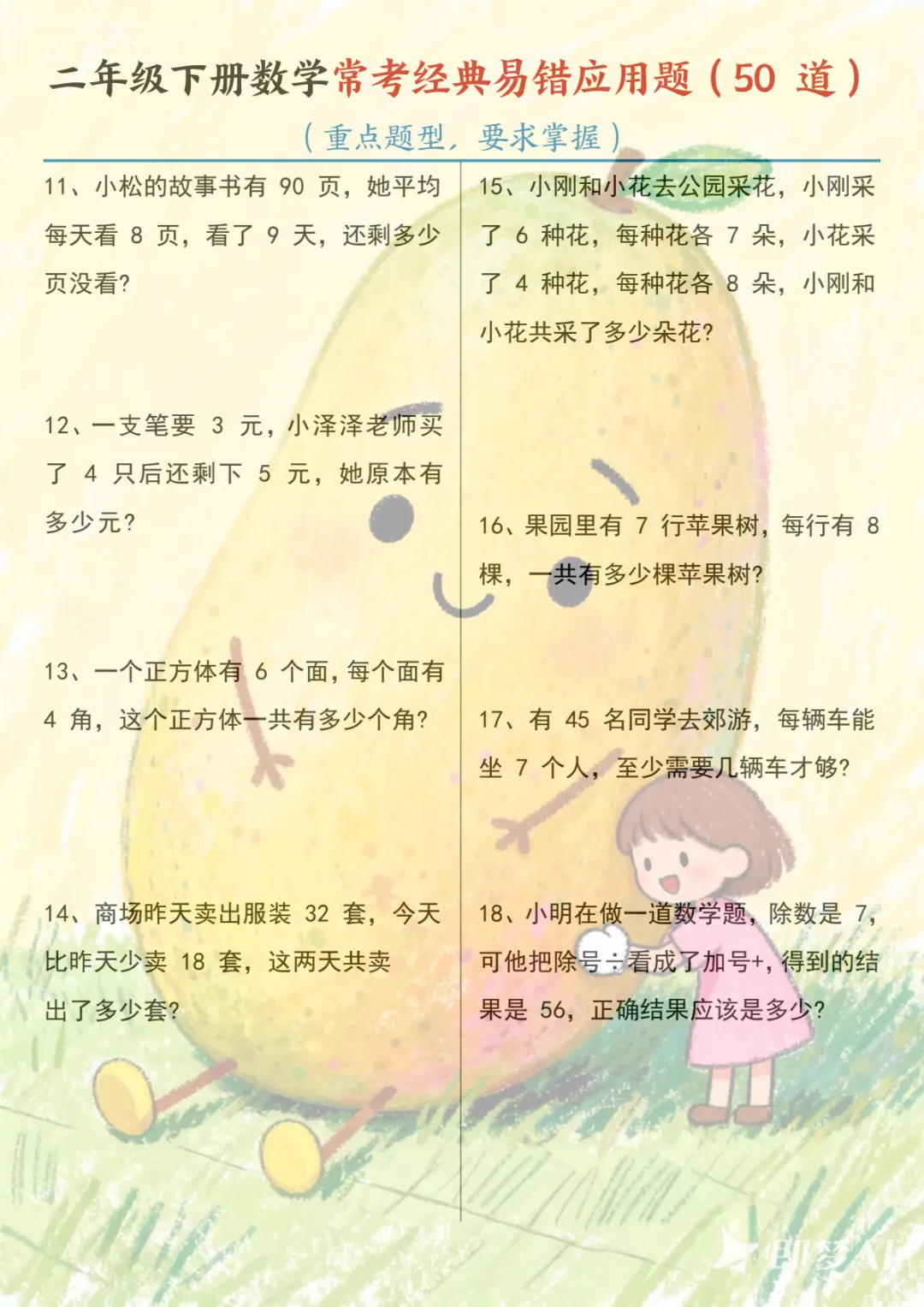二年级下数学常考经典易错应用题50道,共17页,电子版可下载可打印,这份专项练习紧扣二年级数学常考题型与易错应用题训练,涵盖多个核心知识点与专项训练内容,帮助孩子在练习中梳理解题思路、提升审题能力,进一步巩固课堂所学、减少考试中常见失分点。需要的家长可以抓紧下载打印出来,让孩子及时练一练。