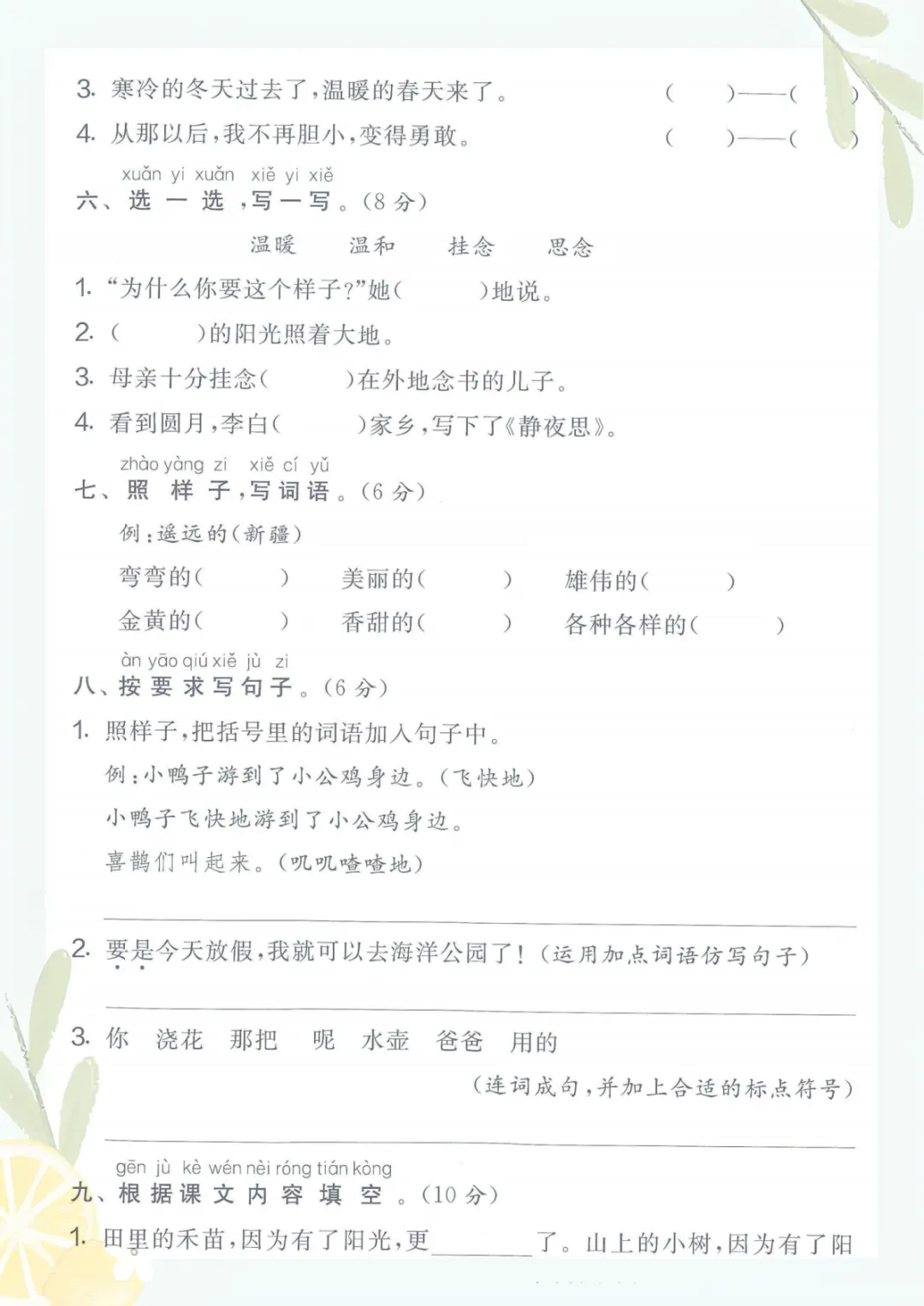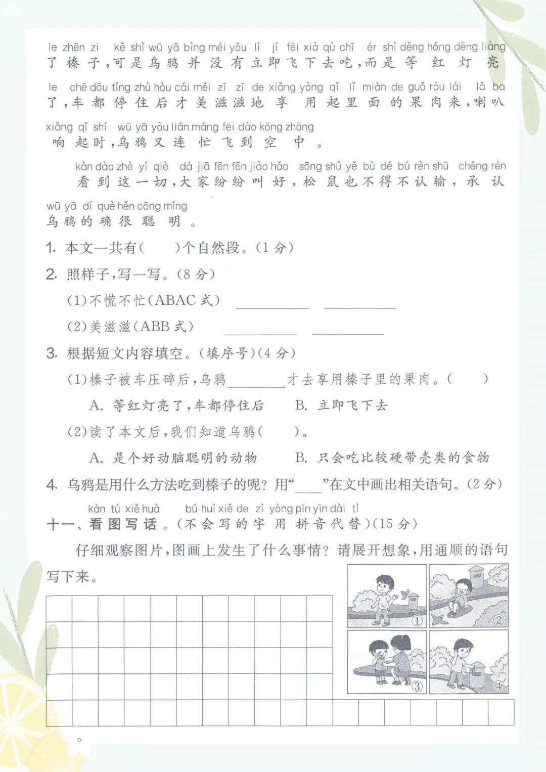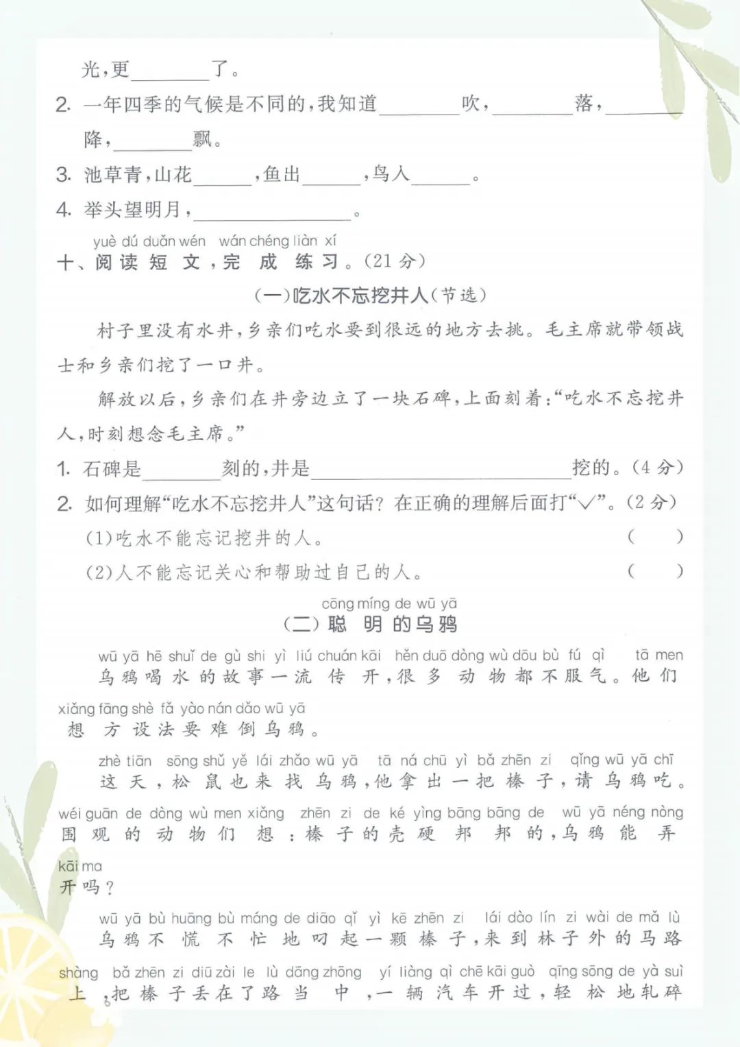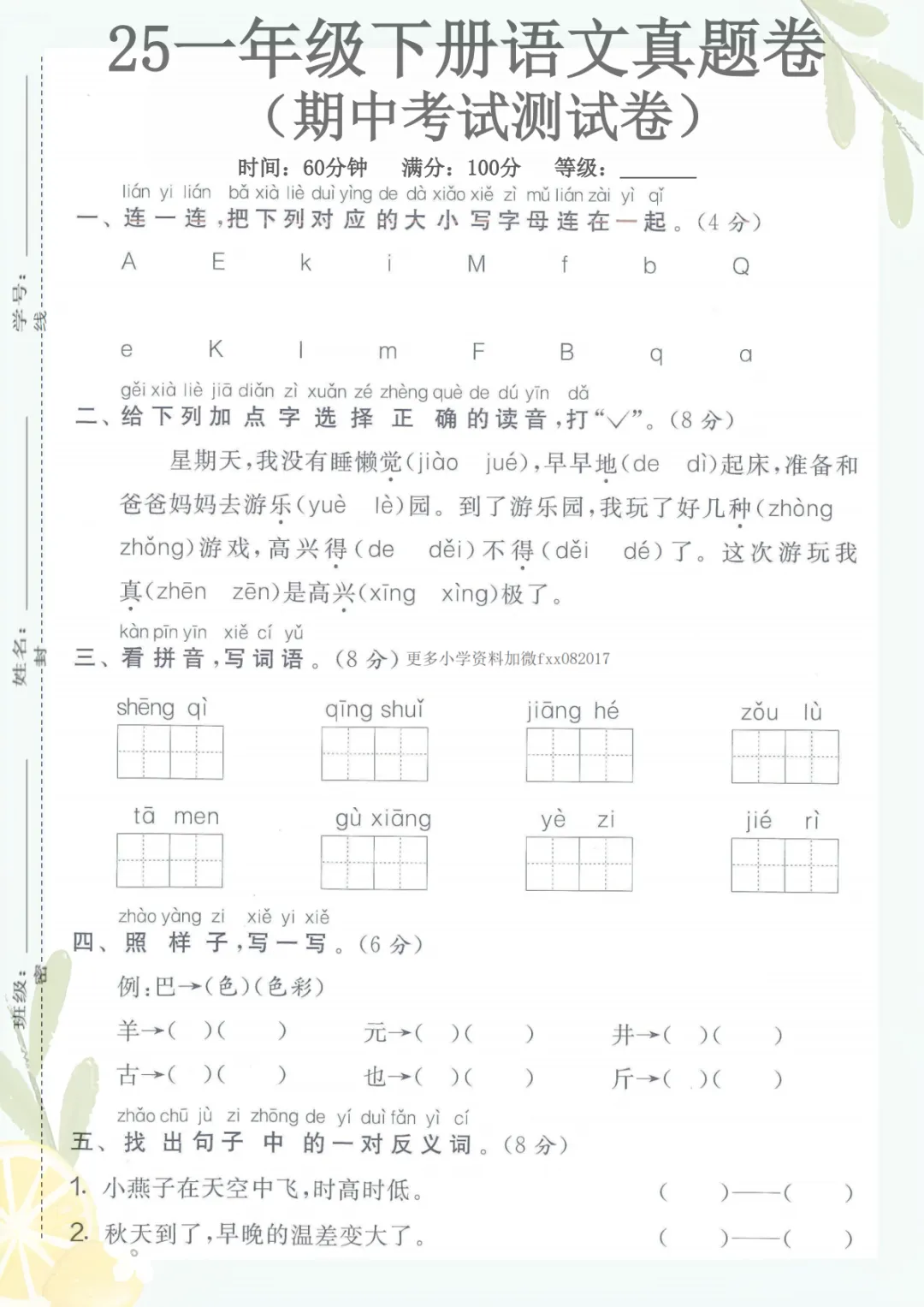 一年级下册语文《期中考试3】》,电子版可打印