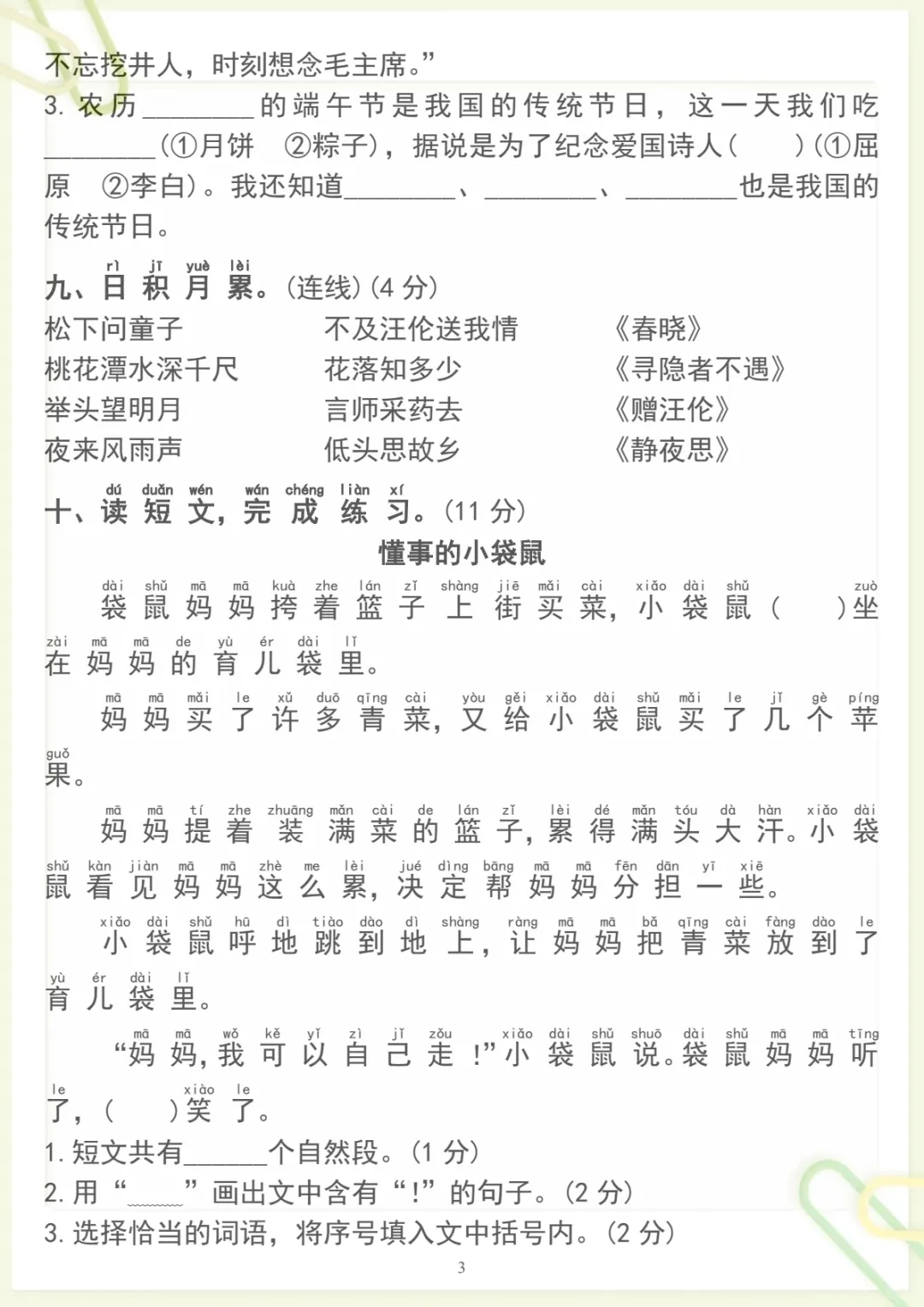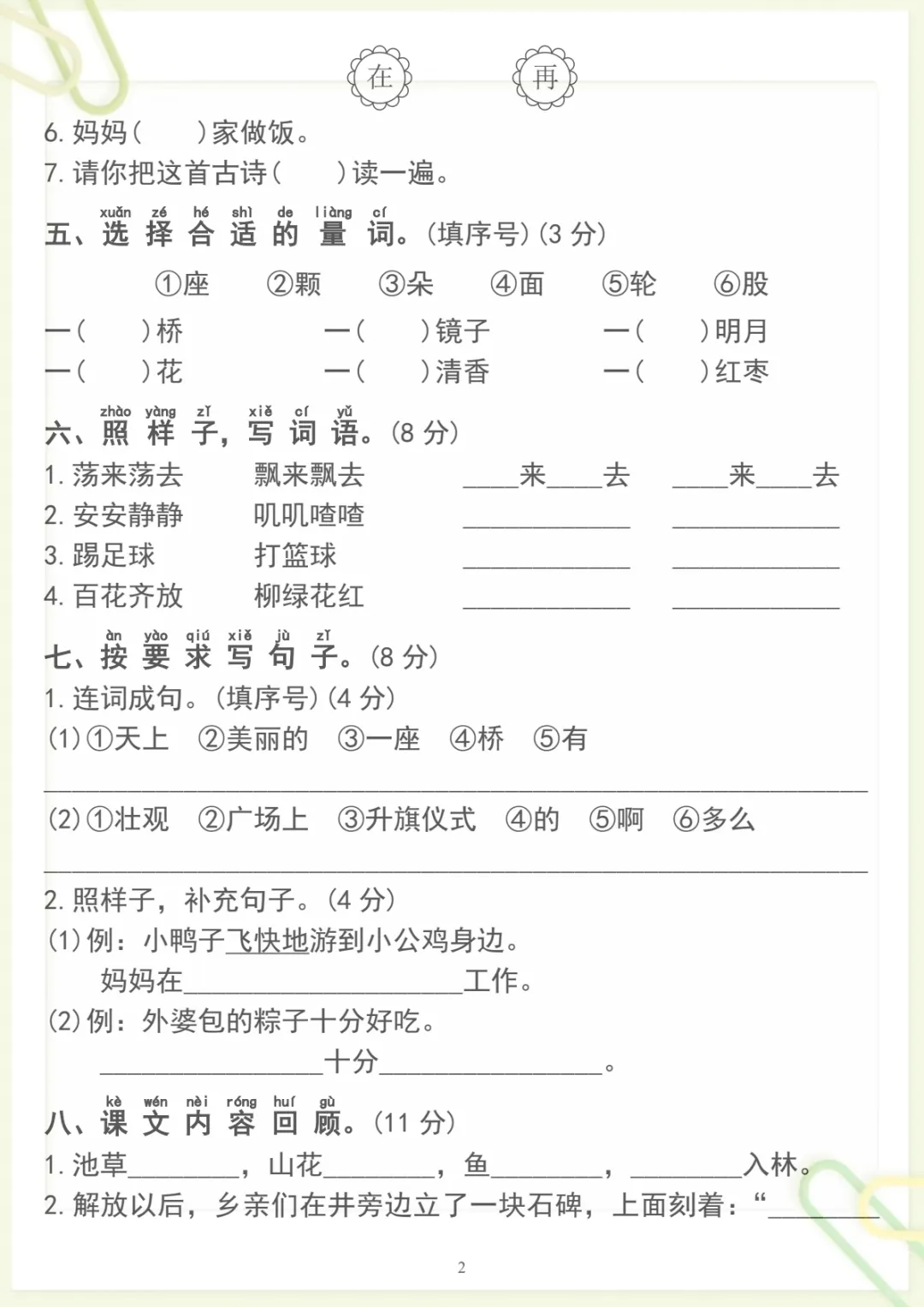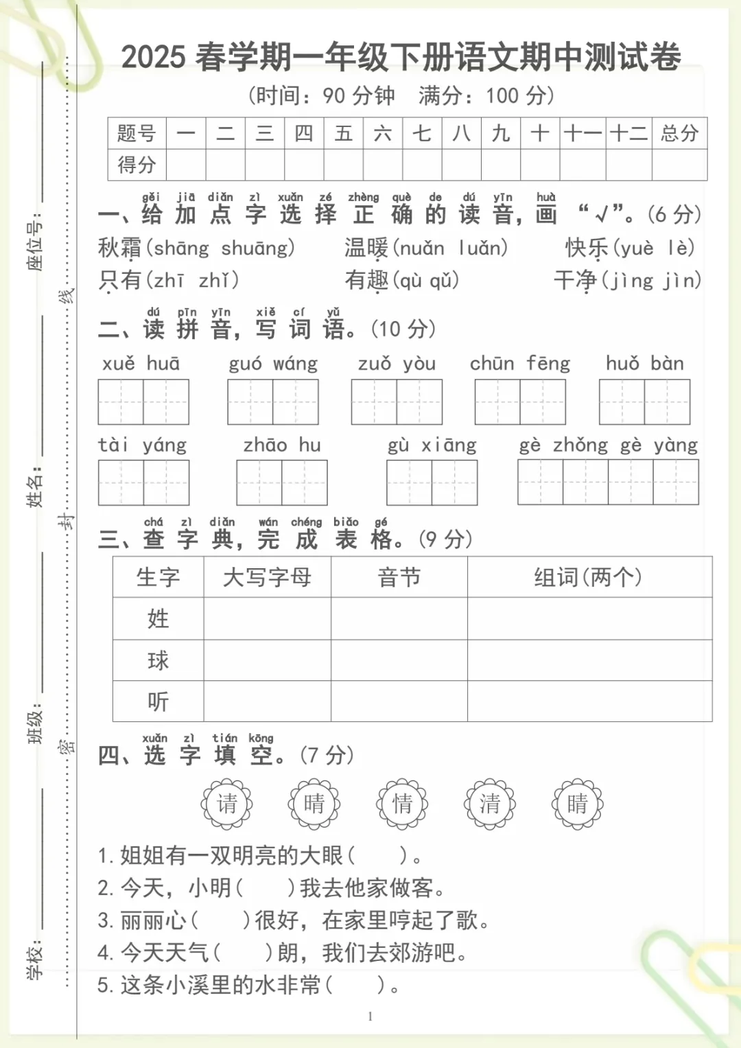 【期中测试卷05】一下语文,共4页,电子版可下载可打印,这份一年级下册语文期中测试卷围绕阶段学习内容进行综合检测,涵盖多个核心知识点与专项训练内容,能够帮助家长了解孩子对本阶段所学内容的掌握情况,也便于孩子在练习中查漏补缺、巩固基础。需要的家长可以及时下载打印,让孩子在期中前后练一练,更有针对性地提升语文学习效果。