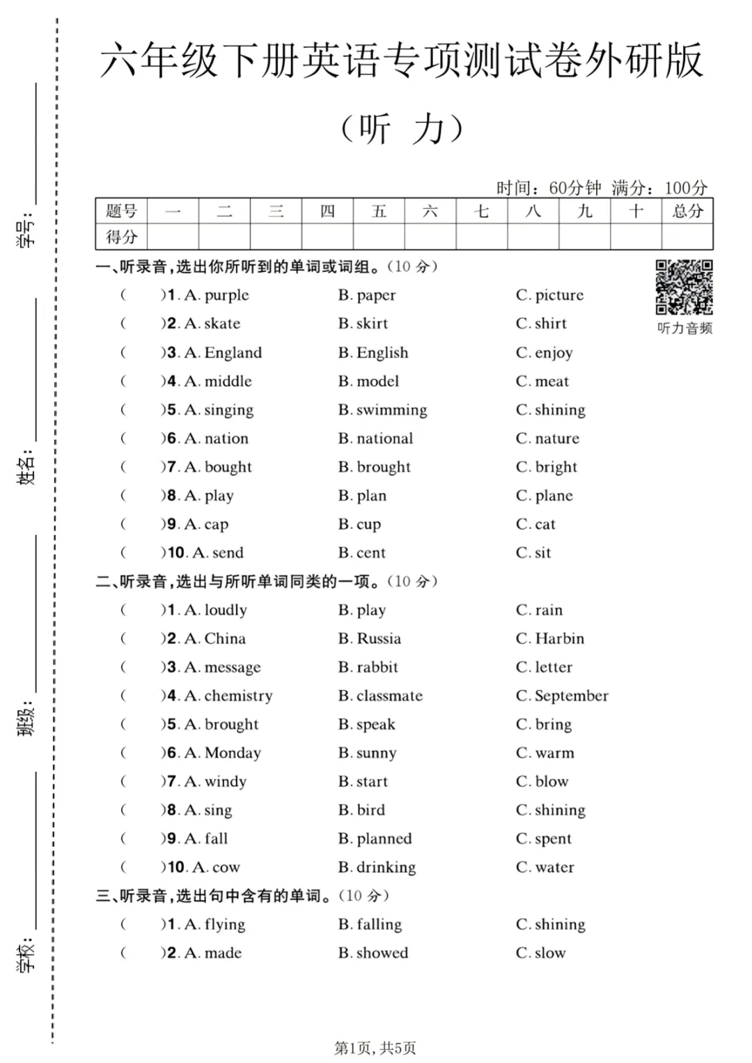 【免费下载】六年级(下)英语 听力专项测试卷《外研版》,PDF电子版,共5页,先保存,以免资源失效