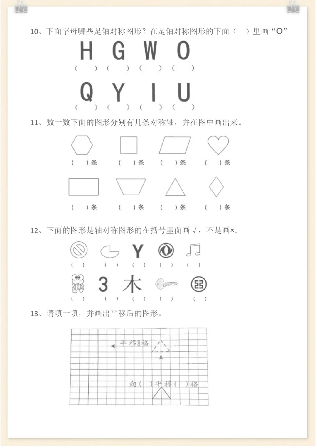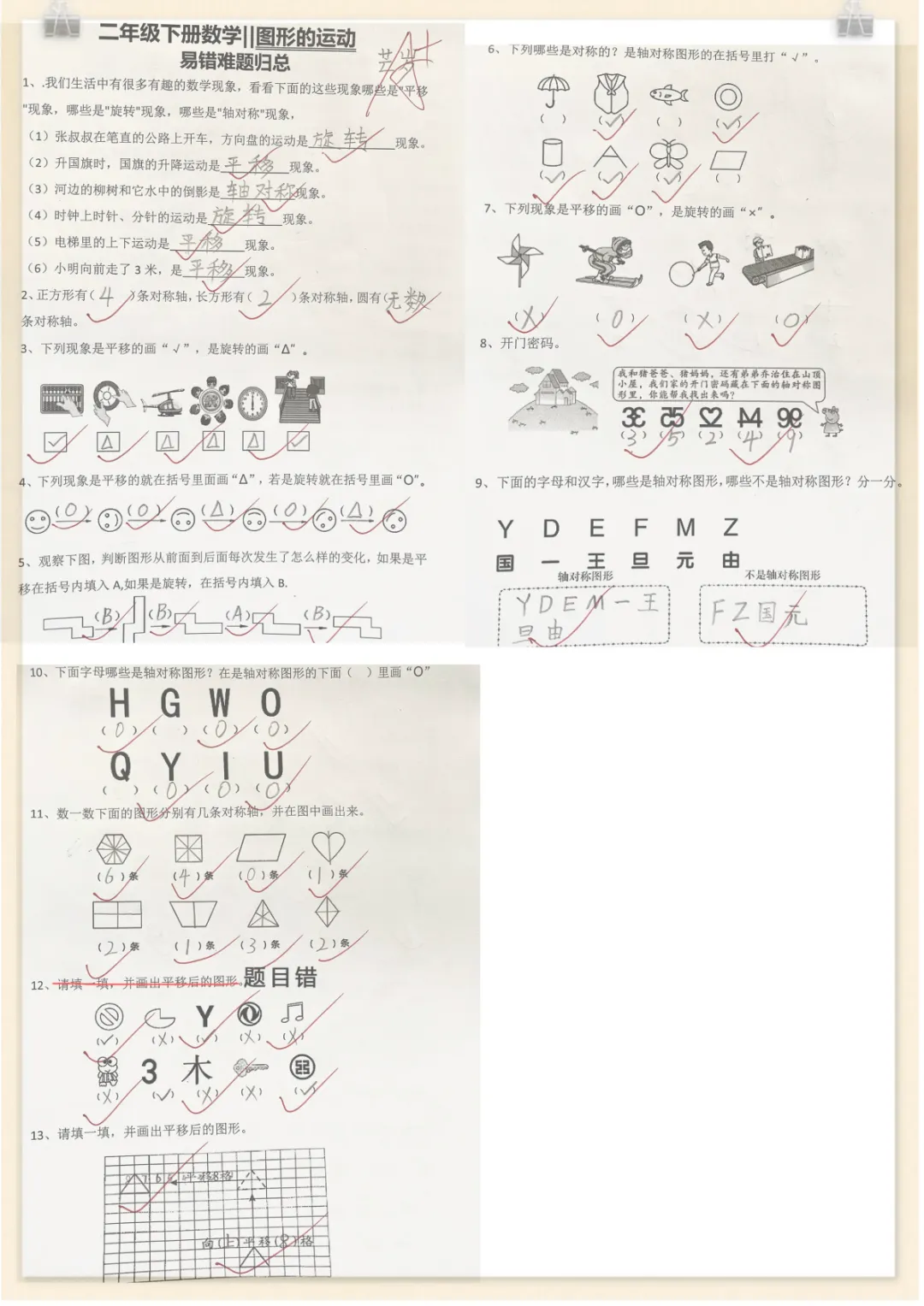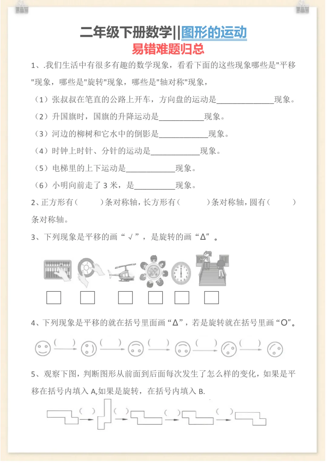 二年级下数学图形运动易错难题归总,共4页,电子版可下载可打印,这份专项练习紧扣二年级下册数学中图形运动相关内容,围绕平移、旋转等常见题型及孩子容易出错的难点进行归纳整理,帮助孩子有针对性地查漏补缺、巩固基础、提升解题能力。内容精炼实用,适合作为课后强化和考前复习使用,需要的家长可以抓紧下载打印出来,让孩子练一练。