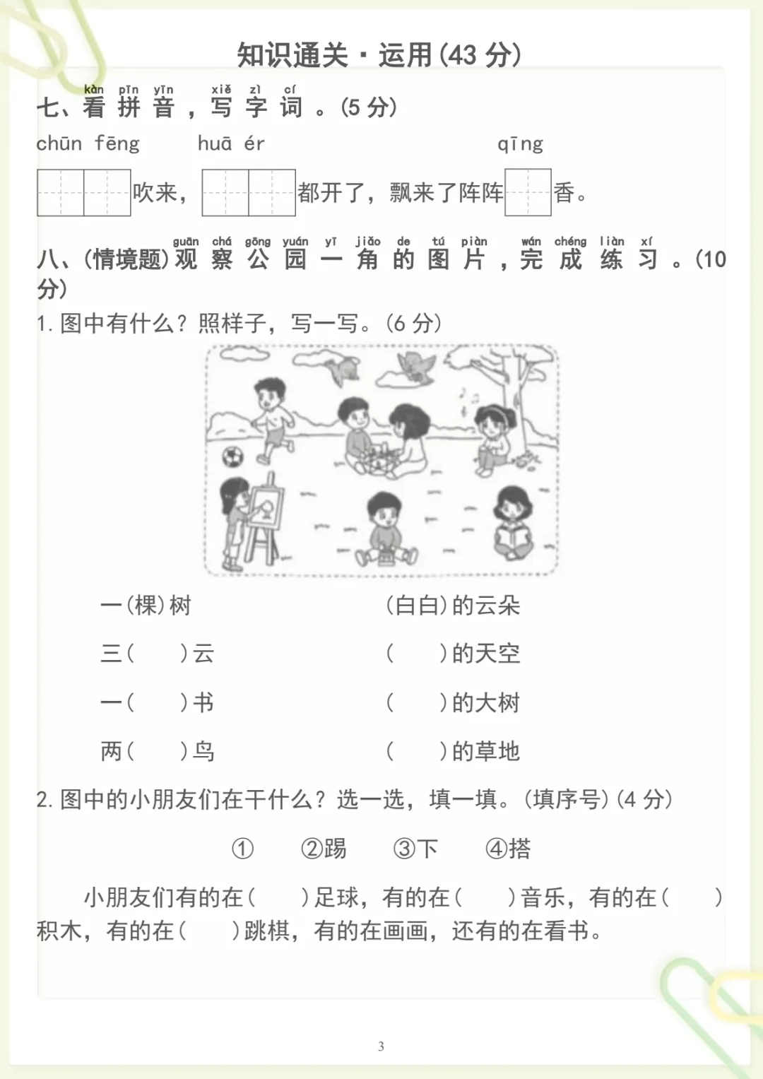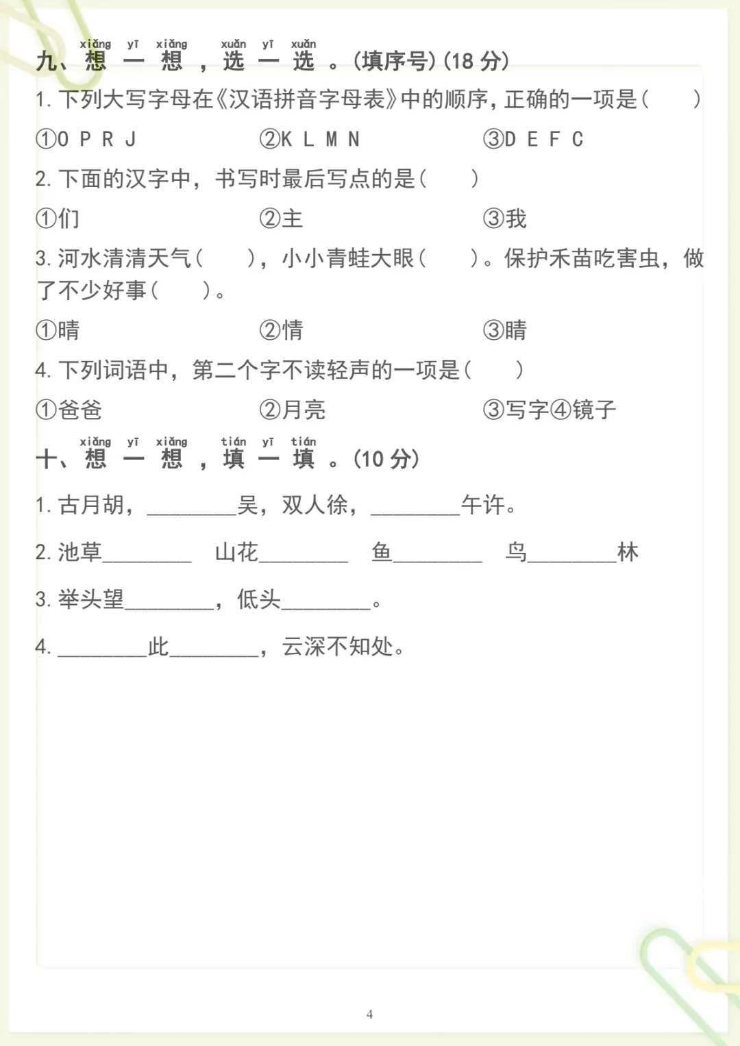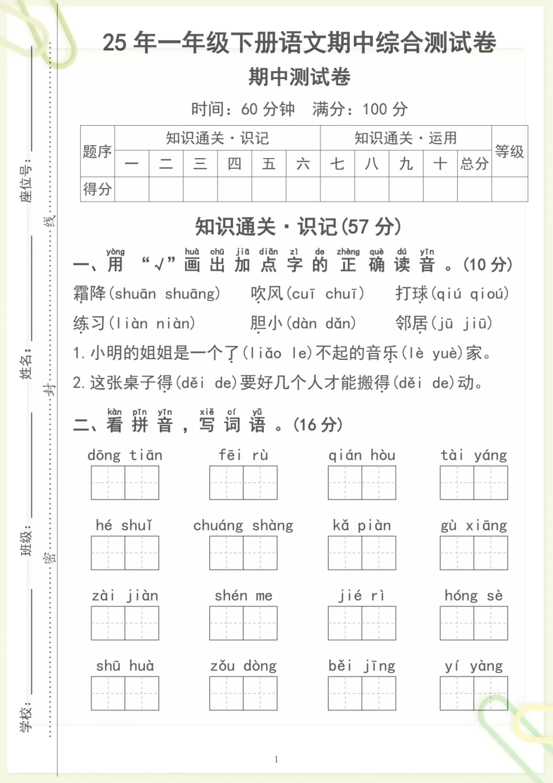 【期中综合测试卷04】一下语文,共4页,电子版可下载可打印,这份一年级下册语文期中综合测试卷围绕阶段学习内容进行整理,涵盖多个核心知识点与专项训练内容,能够帮助孩子在练习中巩固基础、查漏补缺,进一步熟悉题型与答题节奏。对于想在期中前后帮助孩子做好复习与检测的家长来说,这份资料实用又方便,下载后就能直接打印,让孩子及时练一练。