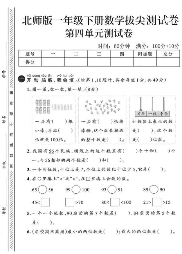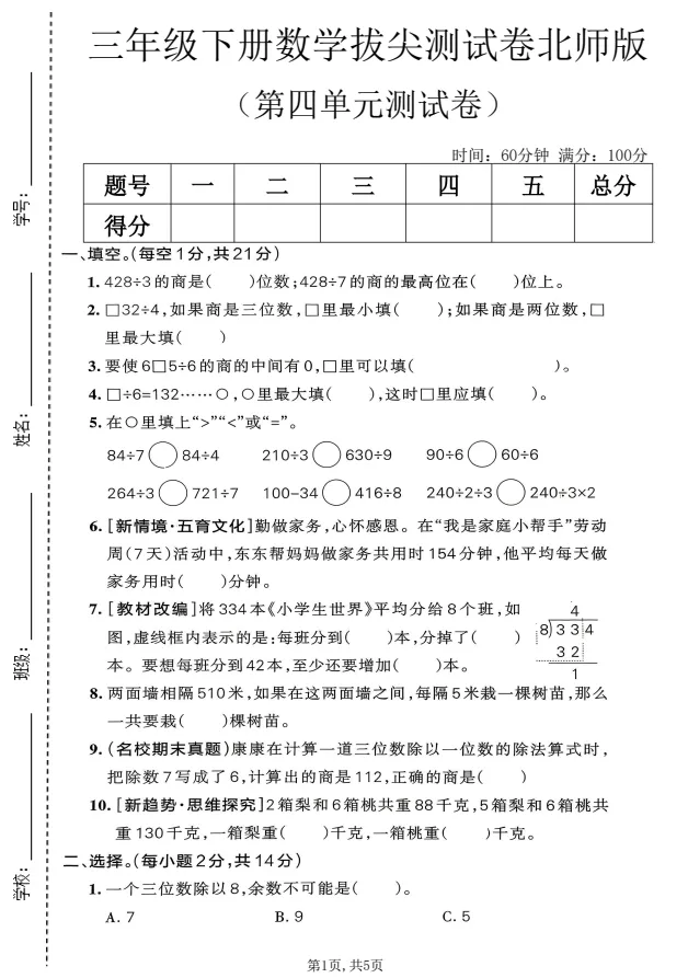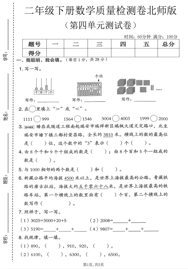 2026年春新【北师大版】一二三年级下册数学《第四单元检测卷》,附答案,完整电子版可打印,家长只需打印出来,让孩子每天练一练。