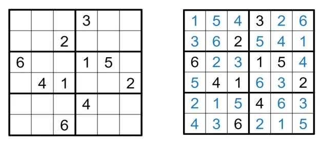 将数字1-6填入空格内, 使每行、每列及每宫内数字均不重复。