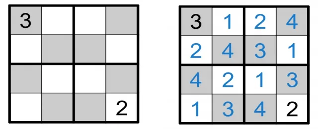 将数字 1-4 填入空格内 , 使得每行、每列 、每宫内数字均不重复。灰色格内只能填较大数 ( 3、4 ), 白色格内只能填较小数 ( 1 、2 )。