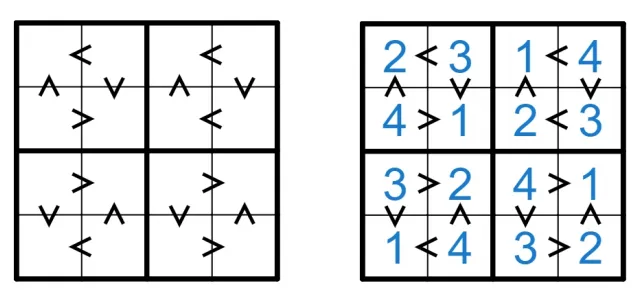 将数字 1-4 填入空格, 使得每行、 每列、每宫内数字均不重复。两格之间的大于号和小于号表示这两格的大小关系。